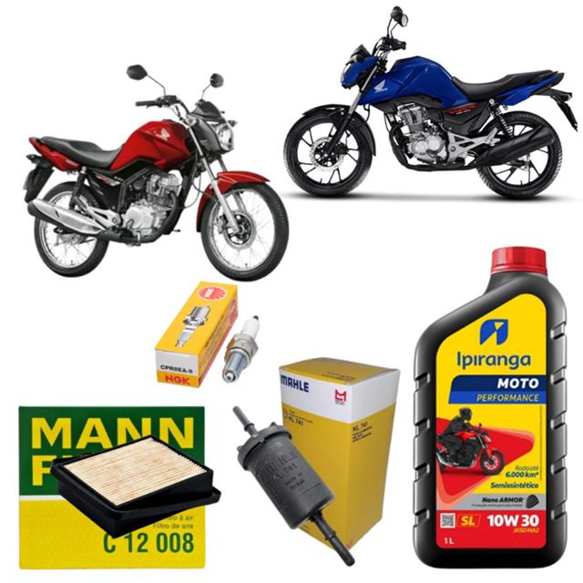 Bem Vindo a loja oficial da VGFC DISTRIBUIÇÃO! A satisfação dos nossos clientes é a nossa prioridade! Retire suas dúvidas antes de realizar a compra! KIT COMPLETO DE REVISÃO – HONDA TITAN / FAN 150 160 Mantenha sua moto com máximo desempenho, economia e durabilidade. Este kit reúne as melhores marcas do mercado, garantindo qualidade, segurança e desempenho superior para o seu motor. Conteúdo do Kit: 1 litro de Óleo Ipiranga Moto Performance 10W30 Semissintético - Proteção exclusiva Nano Armor - Maior vida útil e resistência à oxidação - Melhor desempenho do motor - Ideal para rodar até 6.000 km 1 Filtro de Combustível Mahle KL741 - Alta eficiência de filtragem - Reduz o consumo de combustível - Garante partida rápida e motor limpo - Compatível com Honda CG 150 / 160 1 Filtro de Ar Mann Filter C12008 - Máxima eficiência de retenção de partículas - Fluxo de ar ideal para melhor combustão - Design inteligente e proteção ideal 1 Vela de Ignição NGK CPR8EA-9 - Melhor queima de combustível - Reduz emissões e melhora o desempenho - Partidas mais fáceis e funcionamento suave Por que escolher este kit? MARCAS DE CONFIANÇA: Qualidade e desempenho garantidos com Óleo Ipiranga, Filtro de Combustível Mahle, Filtro de ar Mann Filter e Vela de Ignição NGK, as marcas preferidas dos mecânicos. COMPATIBILIDADE GARANTIDA: Desenvolvido especificamente para Honda CG Titan Fan Start Cargo , modelos acima de 2010. Encaixe perfeito, sem surpresas na instalação. REVISÃO COMPLETA EM UM SÓ KIT: Tenha em mãos tudo que precisa para a manutenção essencial da sua moto: Óleo, Filtro de Ar, Filtro de Combustível e Vela. Economize tempo e dinheiro! DESEMPENHO E ECONOMIA: Mantenha o motor da sua moto protegido, limpo e eficiente. Uma revisão em dia melhora o consumo de combustível e a vida útil do motor. COMPRA SEGURA COM NOTA FISCAL: Somos a VGFC Distribuição, empresa com reputação no mercado. Todos os nossos produtos acompanham Nota Fiscal, garantindo a procedência e seus direitos. Benefícios imediatos após a revisão - Aumento da vida útil do motor - Economia de combustível real - Melhor resposta e desempenho da moto - Redução de falhas e custos futuros de oficina - Compra 100% Segura - Produto com nota fiscal - Envio rápido em até 24h - Garantia do fabricante - Produtos originais e lacrados Dica do especialista: Faça a revisão preventiva da sua moto com componentes originais e mantenha o desempenho de fábrica por muito mais tempo. Seu motor merece o melhor! Dúvidas frequentes 1. Esse kit é realmente compatível com minha Honda CG Titan Fan 150 160? Resposta: Sim! Cada componente do kit — óleo, filtros e vela — foi escolhido para atender exatamente às especificações de fábrica da Honda nos modelos Honda CG Titan Fan 150 160. Garantimos compatibilidade total e uso imediato sem adaptação. 2. Por que devo trocar óleo, filtros e vela juntos? Posso usar só um ou dois itens? Resposta: A troca completa (óleo + filtro de combustível + filtro de ar + vela) é mais eficiente porque assegura que todo o sistema funcione em harmonia. Se trocar só um item, os outros já desgastados podem prejudicar o desempenho ou contaminá-lo. Nosso kit oferece solução completa, com custo-benefício melhor do que comprar item por item isoladamente. 3. Com que frequência devo usar este kit (quando trocar de novo)? Resposta: A recomendação tradicional para motos nacionais é trocar o óleo a cada 3.000 a 5.000 km (verifique o manual da sua moto). Os filtros e vela são trocados no mesmo intervalo para manter toda a performance e evitar desgaste. Mas, se sua moto roda em condições severas (trânsito pesado, poeira, calor intenso), realize a revisão com mais frequência. 4. Qual a data de fabricação do óleo que será enviado? Resposta: Olá! Nossos estoques são renovados constantemente, garantindo que você sempre receberá um produto com data de fabricação recente e dentro do prazo de validade de 5 anos estipulado pelo fabricante. 5. O óleo é o mineral ou semissintético? Resposta: O óleo deste kit é o Ipiranga Moto Performance 10W30 Semissintético, que atende às especificações da Honda para um melhor desempenho e proteção do motor. Se tiver alguma dúvida entre em contato conosco! Sua satisfação é nossa prioridade! ATENÇÃO: - Não nos responsabilizamos pelo mau uso ou instalação indevida do produto. - Recomendamos que a instalação seja realizada por um profissional especializado. - Algumas imagens ( fotos ) são meramente ilustrativas.