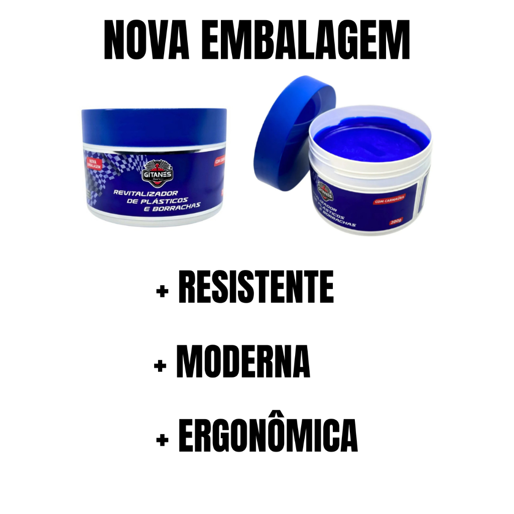 O KIT CONTÉM: 1 REVITALIZADOR AUTOMOTIVO PARACHOQUE, PLÁSTICO, BORRACHA 200G 1 PRETINHO PNEU GITANES 500ML 2 ESPONJAS PARA APLICAÇÃO (BRINDE) Descrição dos produtos que compõem o kit: REVITALIZADOR AUTOMOTIVO PARACHOQUE, PLÁSTICO, BORRACHA 200G - O Revitalizador de Plástico e Borrachas Gitanes oferece proteção e brilho superando os revitalizadores convencionais. Esse poderoso revitalizador dá aspecto de novo, hidrata, dá brilho e escurece superfícies externas como parachoques e detalhes das portas trazendo vida nova por semanas e resiste ao sol e chuva. - Modo de usar: Aplicar uma pequena quantidade de revitalizador em uma esponja espalhando-o homogeneamente e deixar secar por alguns minutos, após a secagem passar um pano seco. PRETINHO PNEU GITANES 500ML O Pretinho Gitanes protege, conserva e dá brilho aos pneus e artigos de borracha de seu veículo. Deixa uma camada protetora nos pneus evitando o ressecamento da borracha. Dica De Uso: Remova as sujeiras tais como lama, terra. Deixe o seu pneu novinho usando Pneu Pretinho Gitanes. Ele dá um brilho intenso nos pneus do seu veículo. Protege os pneus e artigos de borracha. - Brilho Intenso - Maior Durabilidade É um produto especialmente formulado para proteger renovar e dar brilho em pneus e artigos de borrachas em geral. - Modo de usar: Umedeça a esponja seca com PRETINHO GITANES e aplique em pneus, se necessário repetir a aplicação para melhor cobertura. - Composição: Glicerol, água, conservantes e corante.