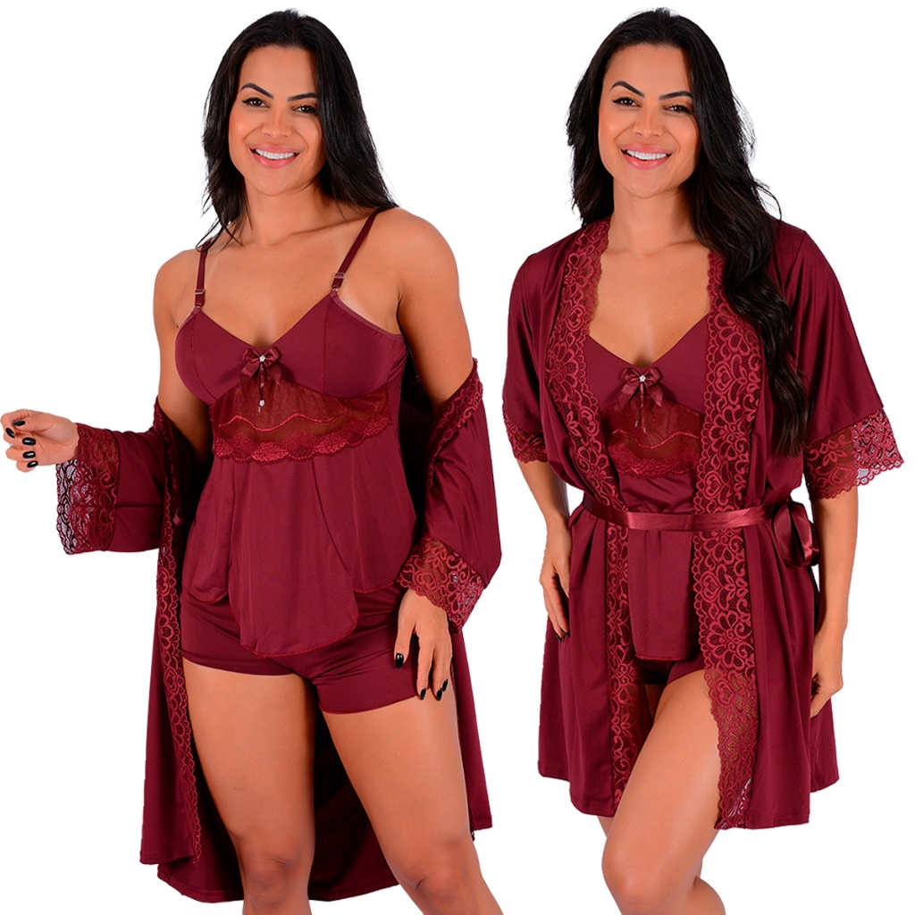 Kit Robe Kimono mais Short Doll Baby Doll Feminino Microfibra e Renda | 0836.850