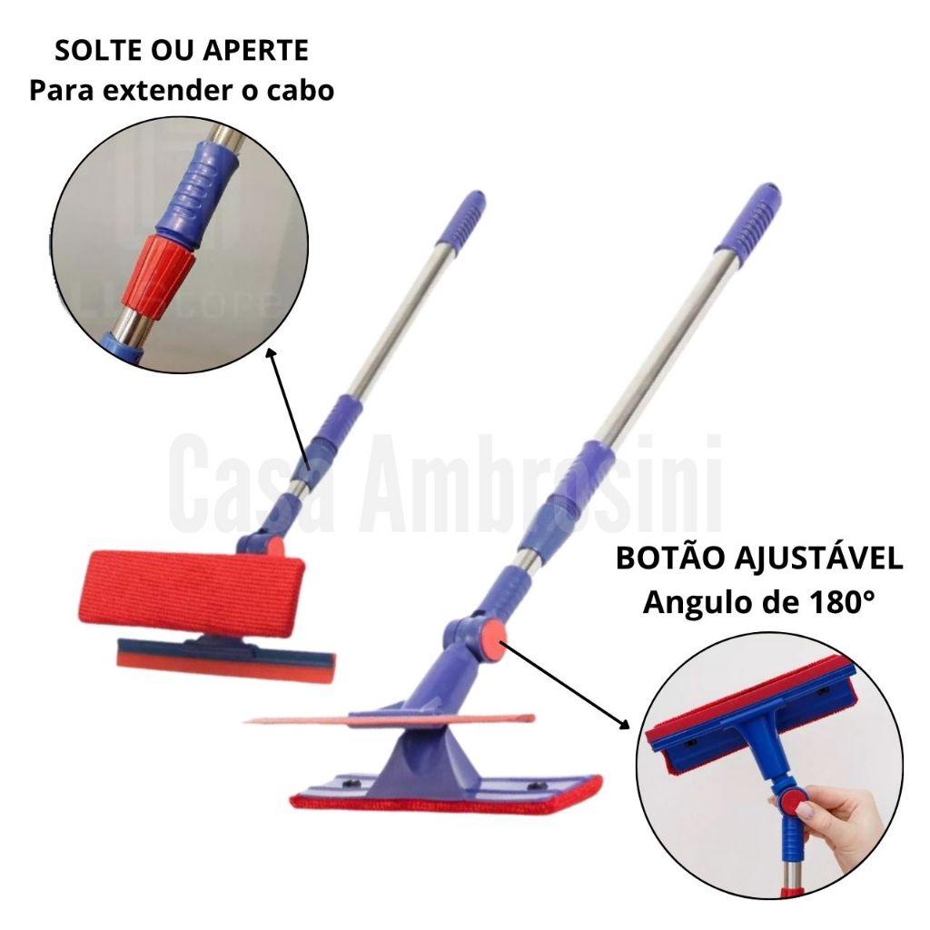KIT Rodo Limpa Vidros + Escova Limpa Trilhos de Janela O Rodo Limpa Vidros com cabo de inox ajustável, uma ferramenta essencial para tornar a limpeza de janelas e superfícies de vidro uma tarefa rápida e eficaz. A cabeça do rodo gira em 360 graus, permitindo um alcance mais amplo e flexível. O rodo pode ser ajustado em uma angulação de até 180 graus, facilitando a limpeza de cantos e quinas. A Escova é feito em microfibras ideal para limpar trilhos de janelas, persianas e cantos difíceis de alcançar, com seu pegador em plástico evita contato com a sujeira e produtos de limpeza tornando a utilização mais confortável e prática na hora de usar . Principais benefícios do Rodo: -Limpeza Eficiente: Com o uso das duas cabeças, este rodo oferece limpeza eficiente em uma variedade de superfícies, desde janelas até azulejos. -Economia: A eliminação de produtos químicos reduz os custos e torna a limpeza mais ecológica. -Conveniência: O cabo ajustável e as duas cabeças tornam esta ferramenta versátil e fácil de usar. -Segurança: Alcançar áreas altas com facilidade evita o risco de escadas e lesões. -Satisfação das Donas de Casa: Este Rodo Limpa Vidros é uma ferramenta que as donas de casa apreciam, pois simplifica a limpeza e oferece resultados excelentes. - Medidas: Rodo 19cm. - Cabo ajustável até 80cm para facilitar o manuseio. - Medidas Escova: 13,6cm x 3,5cm x 8,2cm