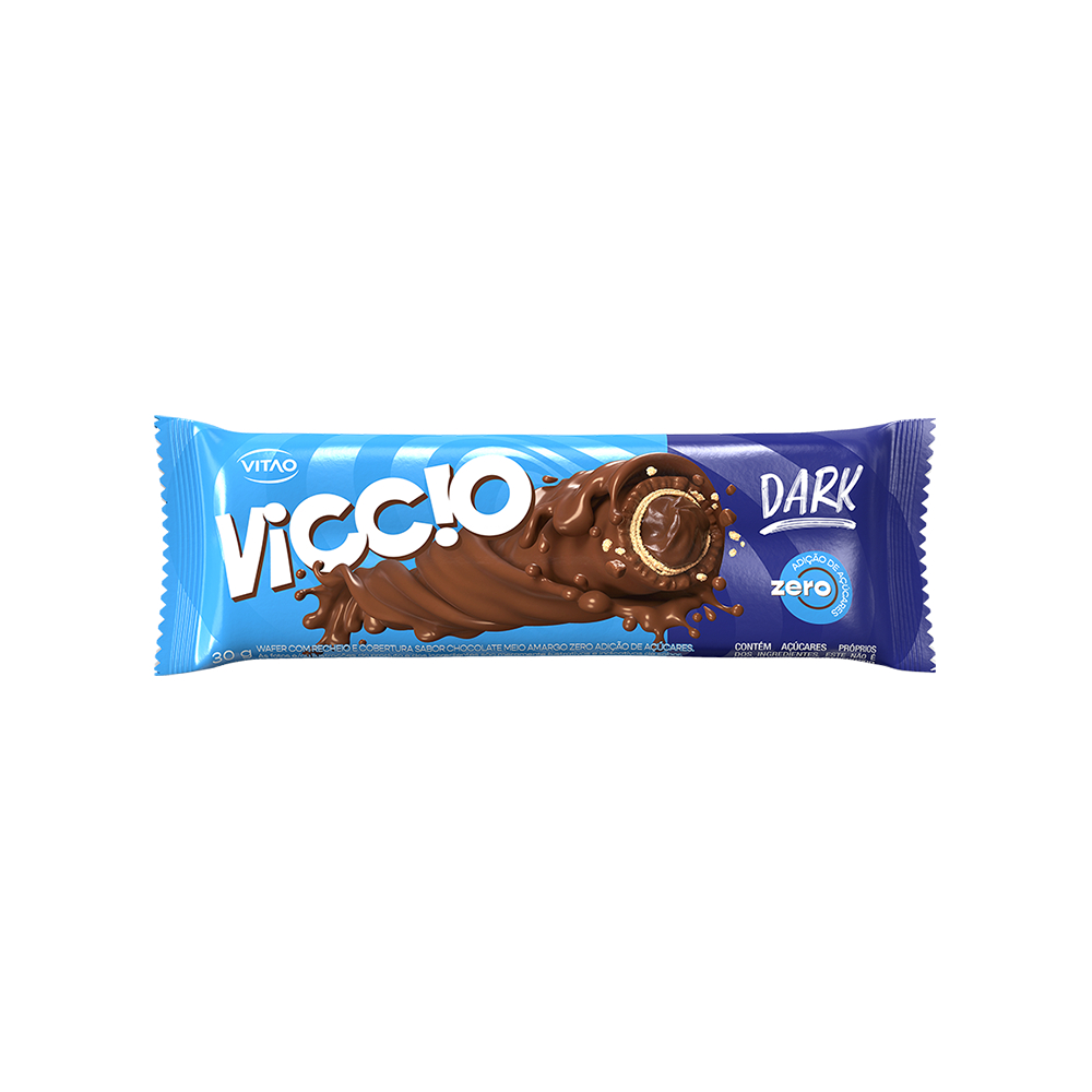 O Viccio Dark é uma deliciosa sobremesa com wafer crocante, recheio e cobertura sabor chocolate meio amargo, sem adição de açúcares. Satisfaça sua vontade de doce sem culpa e desfrute de um sabor intenso e refinado, perfeito para quem busca uma opção mais saudável sem abrir mão de um bom chocolate. INGREDIENTES: Recheio sabor chocolate meio amargo (gordura vegetal, cacau em pó, liquor de cacau, edulcorante maltitol, emulsificante lecitina de soja e aromas), cobertura sabor chocolate meio amargo (gordura vegetal, cacau em pó, liquor de cacau, edulcorante maltitol, emulsificante lecitina de soja, estabilizante INS 476 e aroma) e rolinho de wafer (farinha de trigo enriquecida com ferro e ácido fólico, leite em pó integral, gordura vegetal, edulcorante maltitol, sal, emulsificante lecitina de soja e aroma). ALÉRGICOS: CONTÉM DERIVADOS DE TRIGO, LEITE E SOJA E PODE CONTER AMÊNDOA, CASTANHA-DE-CAJU, AVELÃ, AMENDOIM, AVEIA, CEVADA E CENTEIO. CONTÉM GLÚTEN. CONTÉM LACTOSE. ZERO ADIÇÃO DE AÇÚCARES.