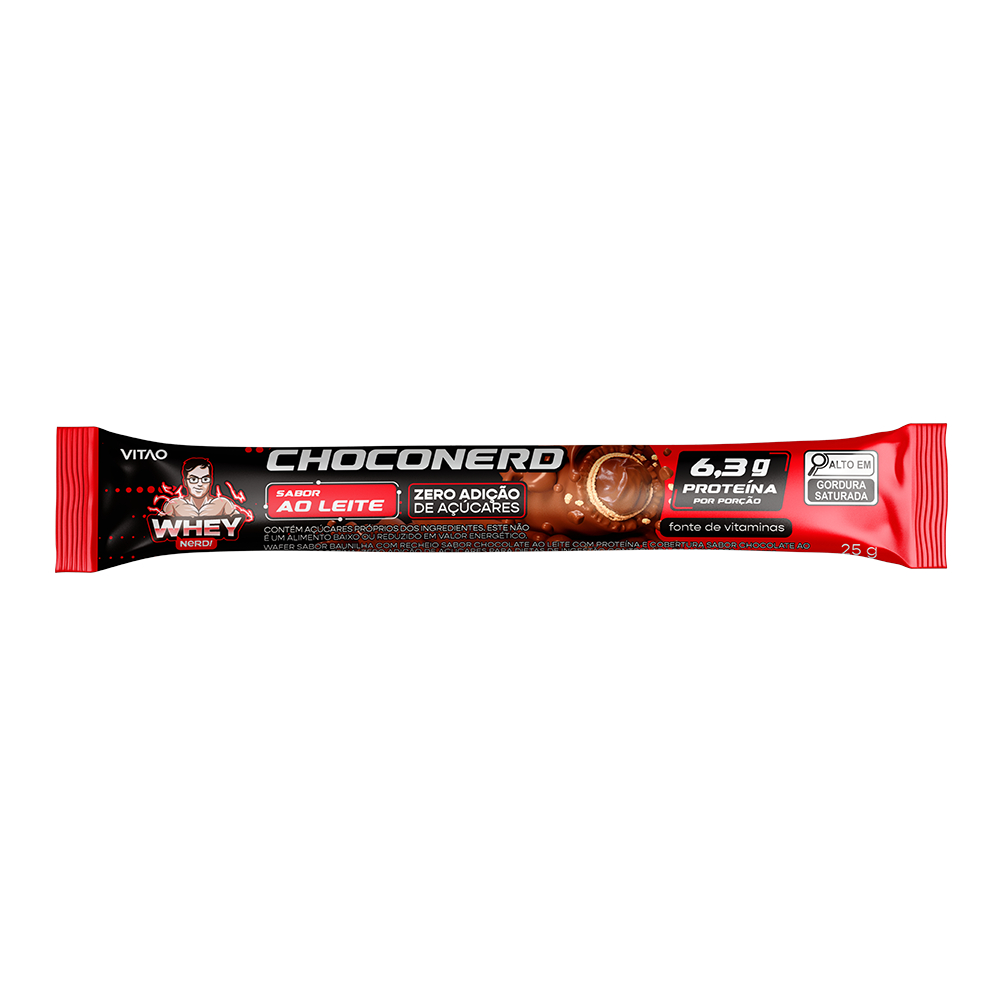 O rolinho wafer chocolate ao leite Choconerd zero açúcar, é uma opção deliciosa e saudável, feito com ingredientes de alta qualidade. Além de proporcionar o sabor irresistível do chocolate ao leite, destaca-se por ter 6,3 g de proteína por porção e ser também fonte de vitaminas. Essa escolha nutritiva e sem açúcares é perfeita para quem busca um doce saboroso e ao mesmo tempo saudável. INGREDIENTES: Cobertura sabor chocolate ao leite com proteína (gordura vegetal, concentrado proteico do soro de leite, leite em pó desnatado, cacau em pó, liquor de cacau, edulcorantes maltitol e sucralose, emulsificante lecitina de soja, estabilizante poliglicerol polirricinoleato e aromas), recheio sabor chocolate ao leite com proteína (concentrado proteico do soro de leite, gordura vegetal, leite em pó desnatado, cacau em pó , leite em pó integral, liquor de cacau, soro de leite desmineralizado,edulcorante maltitol, emulsificante lecitina de soja, Vitamina A (Acetato de retinol), Vitamina C (Ácido Ascórbico), Vitamina D (Colecalciferol), Vitamina B3 (Nicotinamida), Ácido Fólico (Ácido N-pteroil-L-glutâmico), Vitamina B12 (Cianocobalamina), Ferro (Pirofosfato férrico), Zinco (Sulfato de zinco monoidratado) e aroma), wafer sabor baunilha (farinha de trigo enriquecida com ferro e ácido fólico, leite em pó integral, óleo de soja, sal, edulcorante maltitol, emulsificante lecitina de soja e aroma) e crispies proteico de ervilha. ALÉRGICOS: CONTÉM LEITE E DERIVADOS LEITE, TRIGO E SOJA. PODE CONTER CENTEIO, CEVADA, AVEIA, AMENDOIM, AMÊNDOA, AVELÃS, CASTANHA-DE-CAJU, CASTANHA-DO-PARÁ, MACADÂMIAS, NOZES E LÁTEX NATURAL. CONTÉM GLÚTEN. CONTÉM LACTOSE. ZERO ADIÇÃO DE AÇÚCARES, PROTEICO, FONTE DE VITAMINAS.