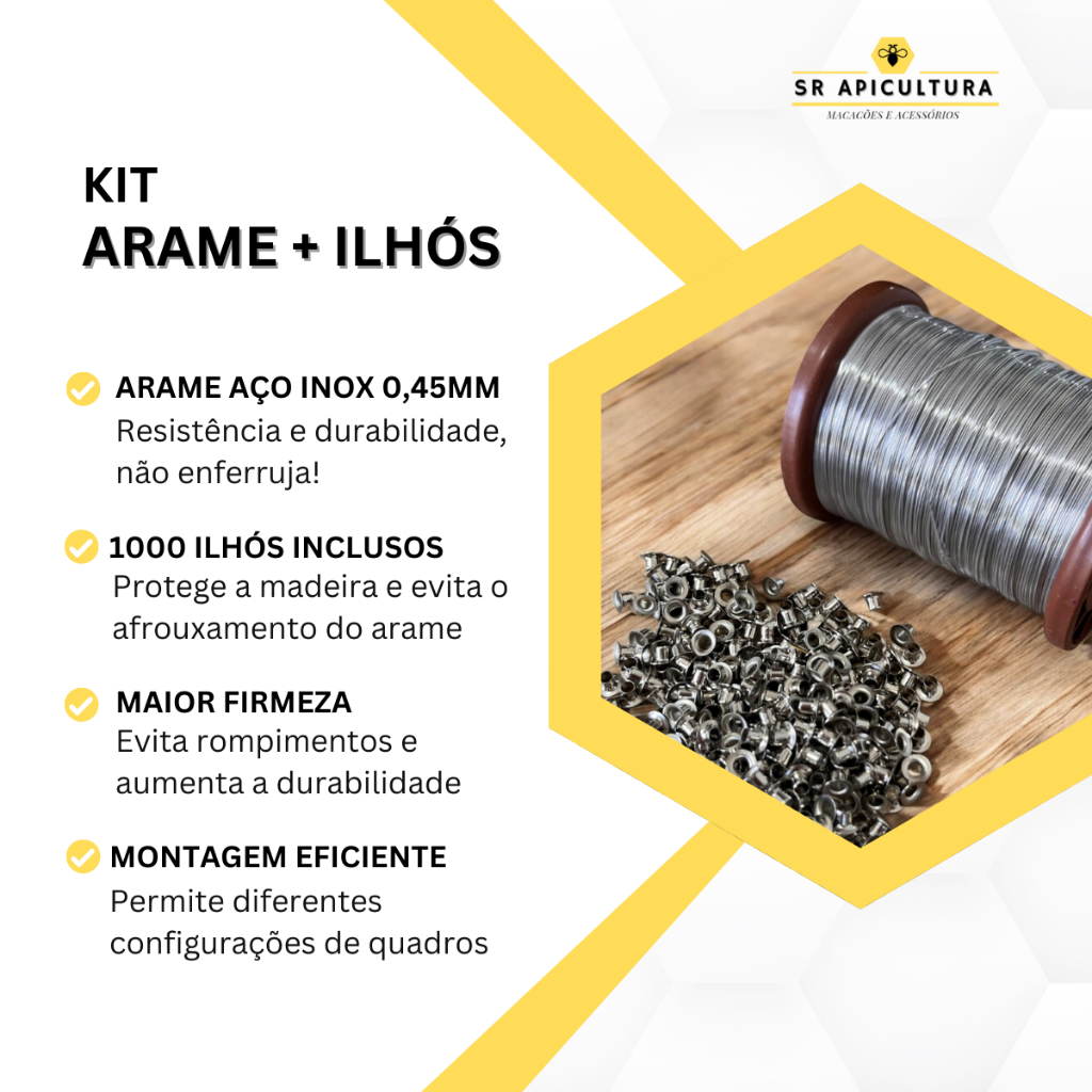 Seja para montagem de quadros de ninho ou melgueira, este kit completo de arame inox e ilhós foi desenvolvido para proporcionar mais firmeza, resistência e longevidade à estrutura dos favos. Alta resistência – O arame inoxidável 0,45 mm não enferruja e suporta variações climáticas. Fixação reforçada – Os ilhós evitam que o arame afunde na madeira, garantindo firmeza e durabilidade. Aproveitamento eficiente – Com este kit, você pode montar: ✔ 125 quadros de ninho (4 fios de arame) ✔ 166 quadros de ninho (3 fios de arame) ✔ 250 quadros de melgueira (2 fios de arame) Especificações Técnicas: Arame inox 0,45mm – Rolo com 348 metros 1000 ilhós resistentes – Dimensões: 6mm (borda maior) x 3,5mm (furo) x 4,5mm (altura) Recomendação de broca: 3mm para um encaixe perfeito Facilidade na Montagem: Ideal para apicultores que buscam um material durável e confiável para otimizar a produção de mel. O kit inclui: -1 rolo de arame inox 0,45mm – 348m -1000 ilhós para reforço dos quadros A SR Apicultura está à disposição, qualquer dúvida, deixe uma mensagem. 🐝