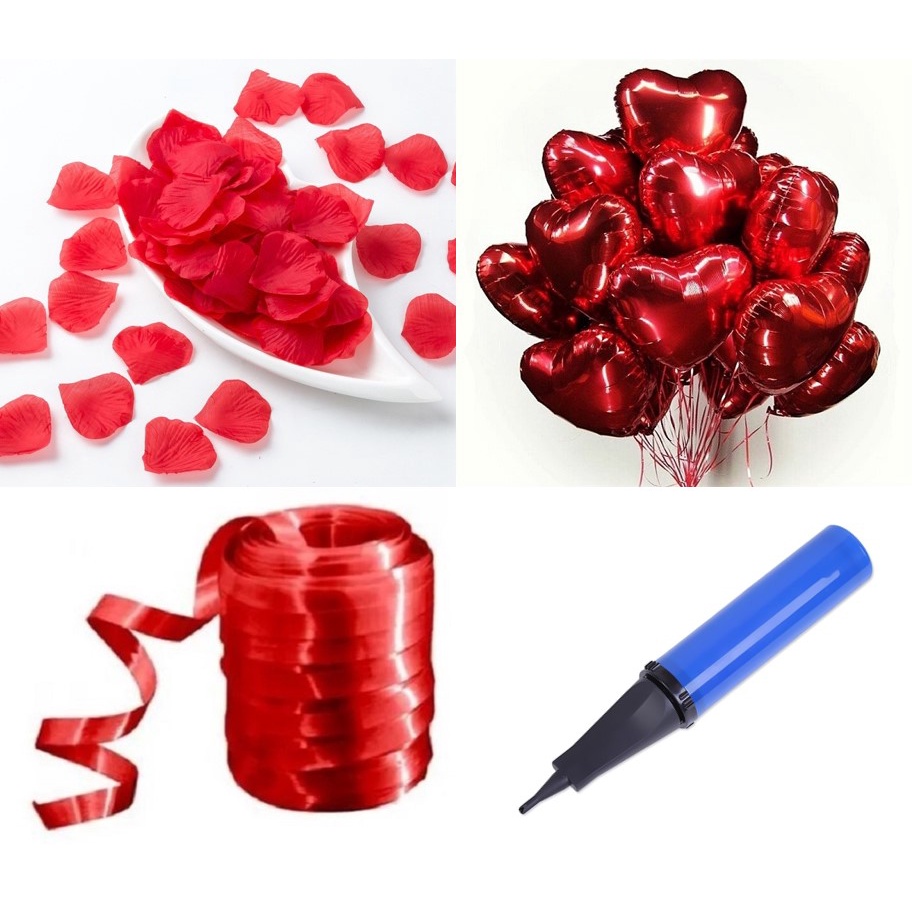 Kit Romântico - 100 Pétalas + 20 Balão Coração + Fitilho + Bomba