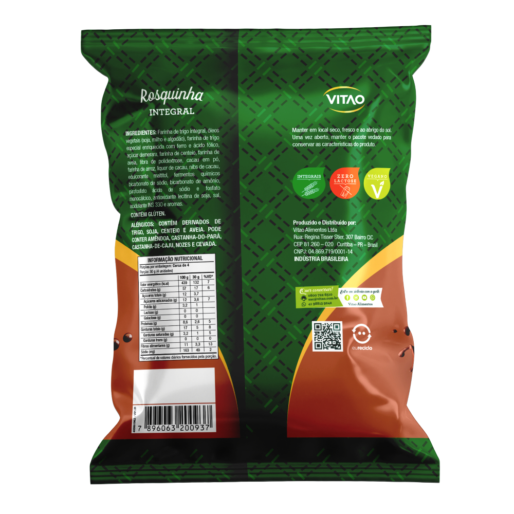As Rosquinhas Integrais de Chocolate são perfeitas para quem deseja saborear um doce nutritivo sem culpa. Indicadas para veganos, intolerantes à lactose e aqueles que buscam opções saudáveis, elas fornecem fibras essenciais e um sabor que agrada a todos. Combine as rosquinhas com um copo de leite vegetal ou um smoothie de frutas para um lanche completo. Elas também podem ser trituradas para criar bases de sobremesas, como tortas ou cheesecakes, adicionando um toque especial. INGREDIENTES: Farinha de trigo integral, óleos vegetais (soja, milho e algodão), farinha de trigo especial enriquecida com ferro e ácido fólico, açúcar demerara, farinha de centeio, farinha de aveia, cacau em pó, fibra de polidextrose, farinha de arroz, liquor de cacau, nibs de cacau, edulcorante maltitol, fermentos químicos bicarbonato de sódio, bicarbonato de amônio, pirofosfato ácido de sódio e fosfato monocálcico, antioxidante lecitina de soja, sal, acidulante INS 330 e aromas. ALÉRGICOS: CONTÉM DERIVADOS DE TRIGO, SOJA, CENTEIO E AVEIA. PODE CONTER AMÊNDOA, CASTANHA-DO-PARÁ, CASTANHA-DE-CAJU, NOZES E CEVADA. CONTÉM GLÚTEN. NÃO CONTÉM LACTOSE. INTEGRAL, ZERO LACTOSE, VEGANO, FONTE DE FIBRAS.