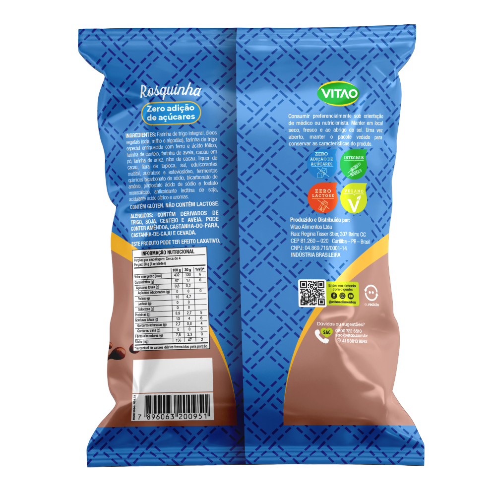 As Rosquinhas Integrais Zero Açúcar sabor Chocolate da Vitao são uma opção deliciosa e saudável para um lanche nutritivo. Feitas com 48,3% de ingredientes integrais, essas rosquinhas oferecem uma combinação perfeita de sabor e nutrição. São completamente livres de lactose, tornando-as adequadas para pessoas com intolerância à lactose. Além disso, são veganas, atendendo às necessidades daqueles que seguem uma dieta baseada em plantas. As rosquinhas são uma opção ideal para um lanche rápido, seja em casa, no trabalho ou na academia. Desfrute como lanche puro ou combine com iogurte e frutas frescas para uma refeição nutritiva. INGREDIENTES: Farinha de trigo integral, óleos vegetais (soja, milho e algodão), farinha de trigo especial enriquecida com ferro e ácido fólico, farinha de centeio, farinha de aveia, cacau em pó, farinha de arroz, nibs de cacau, liquor de cacau, fibra de tapioca, sal, edulcorantes maltitol, sucralose e esteviosídeo, fermentos químicos bicarbonato de sódio, bicarbonato de amônio, pirofosfato ácido de sódio e fosfato monocálcico, antioxidante lecitina de soja, acidulante ácido cítrico e aromas. ALÉRGICOS: CONTÉM DERIVADOS DE TRIGO, SOJA, CENTEIO E AVEIA. PODE CONTER AMÊNDOA, CASTANHA-DO-PARÁ, CASTANHA-DE-CAJU E CEVADA. CONTÉM GLÚTEN. NÃO CONTÉM LACTOSE. INTEGRAL, ZERO ADIÇÃO DE AÇÚCARES, ZERO LACTOSE, VEGANO.