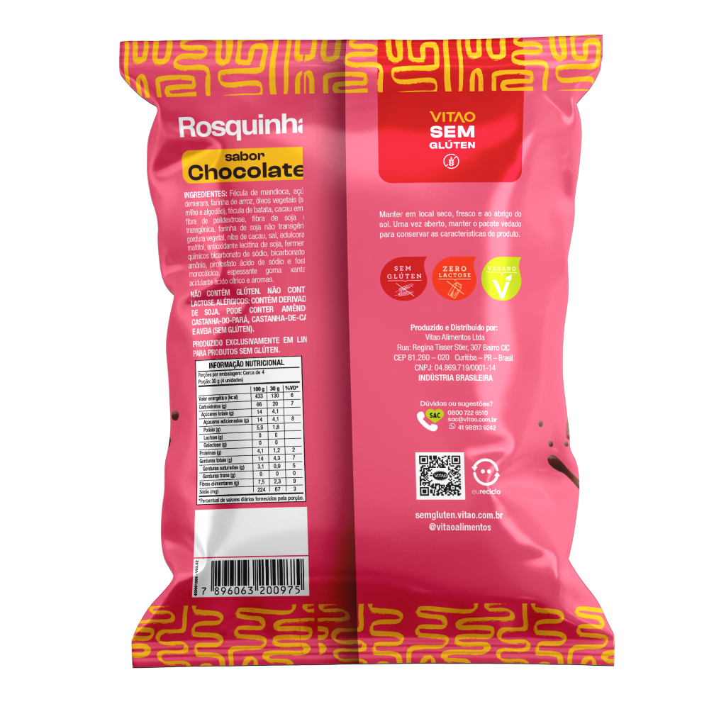 As rosquinhas Sem Glúten sabor Chocolate da Vitao são uma opção deliciosa e saudável para um lanche nutritivo. Feitas com ingredientes integrais, essas rosquinhas oferecem uma combinação perfeita de sabor e nutrição. São completamente livres de lactose, tornando-as adequadas para pessoas com intolerância à lactose. Além disso, são veganas, atendendo às necessidades daqueles que seguem uma dieta baseada em plantas. As rosquinhas são adoçadas com Stevia, uma opção natural e de baixa caloria, permitindo que você desfrute de seu sabor doce sem culpa. Com cada mordida, você irá saborear a crocância e o delicioso sabor de chocolate. Desfrute de um lanche saudável e saboroso em qualquer momento do dia. INGREDIENTES: Fécula de mandioca, açúcar demerara, farinha de arroz, óleos vegetais (soja, milho e algodão), fécula de batata, cacau em pó, fibra de polidextrose, fibra de soja não transgênica, farinha de soja não transgênica, gordura vegetal, nibs de cacau, sal, edulcorante maltitol, antioxidante lecitina de soja, fermentos químicos bicarbonato de sódio, bicarbonato de amônio, pirofosfato ácido de sódio e fosfato monocálcico, espessante goma xantana, acidulante ácido cítrico e aromas. ALÉRGICOS: CONTÉM DERIVADOS DE SOJA. PODE CONTER AMÊNDOA, CASTANHA-DO-PARÁ, CASTANHA-DE-CAJU E AVEIA (SEM GLÚTEN). NÃO CONTÉM GLÚTEN. NÃO CONTÉM LACTOSE. SEM GLÚTEN, ZERO LACTOSE, VEGANO.