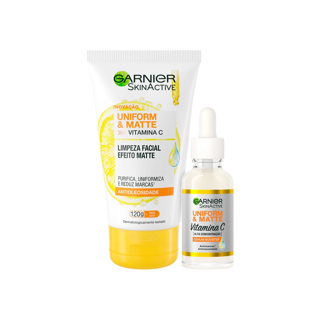 Enriquecido com ingredientes naturais e Vitamina C, o novo Sabonete Limpeza Facial Uniform & Matte de Garnier limpa profundamente, removendo impurezas, oleosidade e maquiagem, sem agredir a pele. De textura leve e cremosa, ele limpa ao mesmo tempo que hidrata, reduz imperfeições e dura um tempão (360 usos). Combinação de poderosos ativos naturais: - Vitamina c: poderoso antioxidante estimulador de colágeno que regenera, unifica e reduz as imperfeições. - AHA de limão: ativo natural que controla oleosidade sem agredir, garantindo toque seco por 12 horas. Benefícios: - Pele uniforme e matte - Reduz marcas: suaviza imperfeições, deixando a pele mais lisa e uniforme - Remove a oleosidade - Sensação de pele limpa - Efeito purificante. Quer um Efeito Peeling em casa e sem gastar muito? O novo Garnier Uniform & Matte Sérum Booster tem Alta Concentração de Vitamina C, Niacinamida, Ácido Salicílico e Extrato de Limão, que garantem marcas menos visíveis, pele uniformizada e hidratada, sem deixá-la oleosa. A textura sérum garante fácil aplicação, sensação gostosa pós uso e rápida absorção. Resultados comprovados pelas consumidoras: 87% das consumidoras sentiu redução das marcas, 90% sentiu textura não oleosa e 87% sentiu a pele mais uniforme e mais hidratada. RESULTADOS VISÍVEIS E COMPROVADOS: - Redução de manchas garantida pela ação antioxidante da vitamina C - Pele com efeito matte, garantido pelo Ácido Salicílico - Pele hidratada, graças à Niacinamida NOSSA TECNOLOGIA: Alta Concentração de Vitamina C: Poderoso antioxidante que reduz marcas, imperfeições e uniformiza a pele Ácido Salicílico: Garante um efeito matte antioleosidade e uniformização da pele reduzindo a aparência de poros e deixando a pele com um aspecto mais liso. Niacinamida: Hidratação da pele Aprovado por dermatologistas, para todas nós!