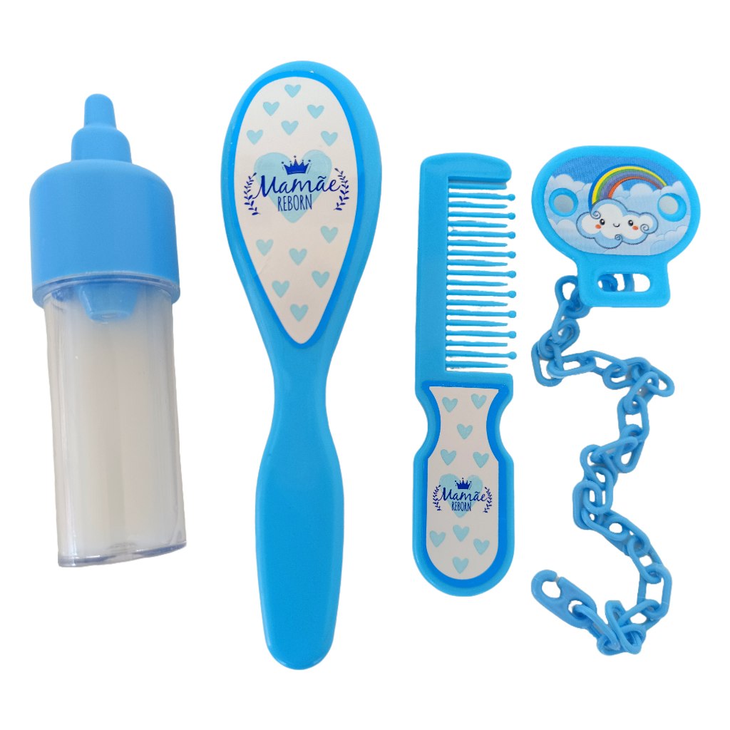 01 - Bolsa maternidade Azul 01 - Pagão com 5 peças (calça, camiseta, casaquinho, luvas e meias) 01 - Chupeta 01 - Prendedor de chupeta 01 - Mamadeira leite falso 01 - Pente 01 - Escova 01 - Certidão de nascimento 03 - FRALDAS TOTAL DE 15 ITENS!