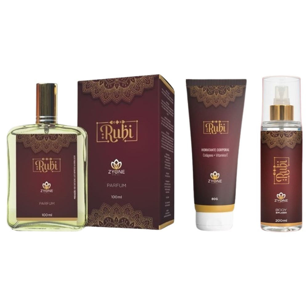 Kit Rubi Zyone Árabe Perfume, Creme Hidratante e Body Splash Feminino Alta Fixação Essência Parfum