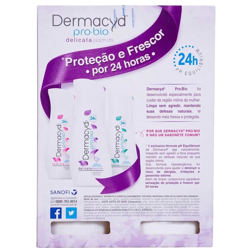 Kit Sabonete Líquido Íntimo Delicata Jasmim Dermacyd 200ml + 100ml Para ficar protegida e tranquila 24 horas, você conta com o Sabonete Íntimo Dermacyd® Femina Floral, que cuida da região íntima e ainda possui notas florais. Sua fórmula exclusiva pH Equilibrium age naturalmente limpando sem agredir a flora. Sua fórmula hipoalergênica foi desenvolvida para ajudar a diminuir o risco de alergias, irritações e possíveis odores. Diferente dos sabonetes comuns ou bactericidas, o novo Dermacyd® Femina Floral tem pH similar ao da região íntima, que mantém as defesas naturais, por isso pode ser usado diariamente. Dermacyd® é a marca de sabonete íntimo que está sempre ao seu lado porque conhece as necessidades e os desafios que as mulheres enfrentam diariamente. Foi aprofundando esse conhecimento que, em nossos 30 anos de Brasil, conquistamos a confiança de milhões de brasileiras e celebramos a liderança absoluta no segmento. Principais características - Frescor e proteção por 24 horas. - Hipoalergênico. - Notas florais - Kit exclusivo com as versões 200ml e 100ml. Modo de Usar: No banho, agite o produto, coloque uma pequena quantidade na palma da mão e aplique na região íntima externa. Em seguida, enxague bem para que não fique nenhum resíduo do produto.
