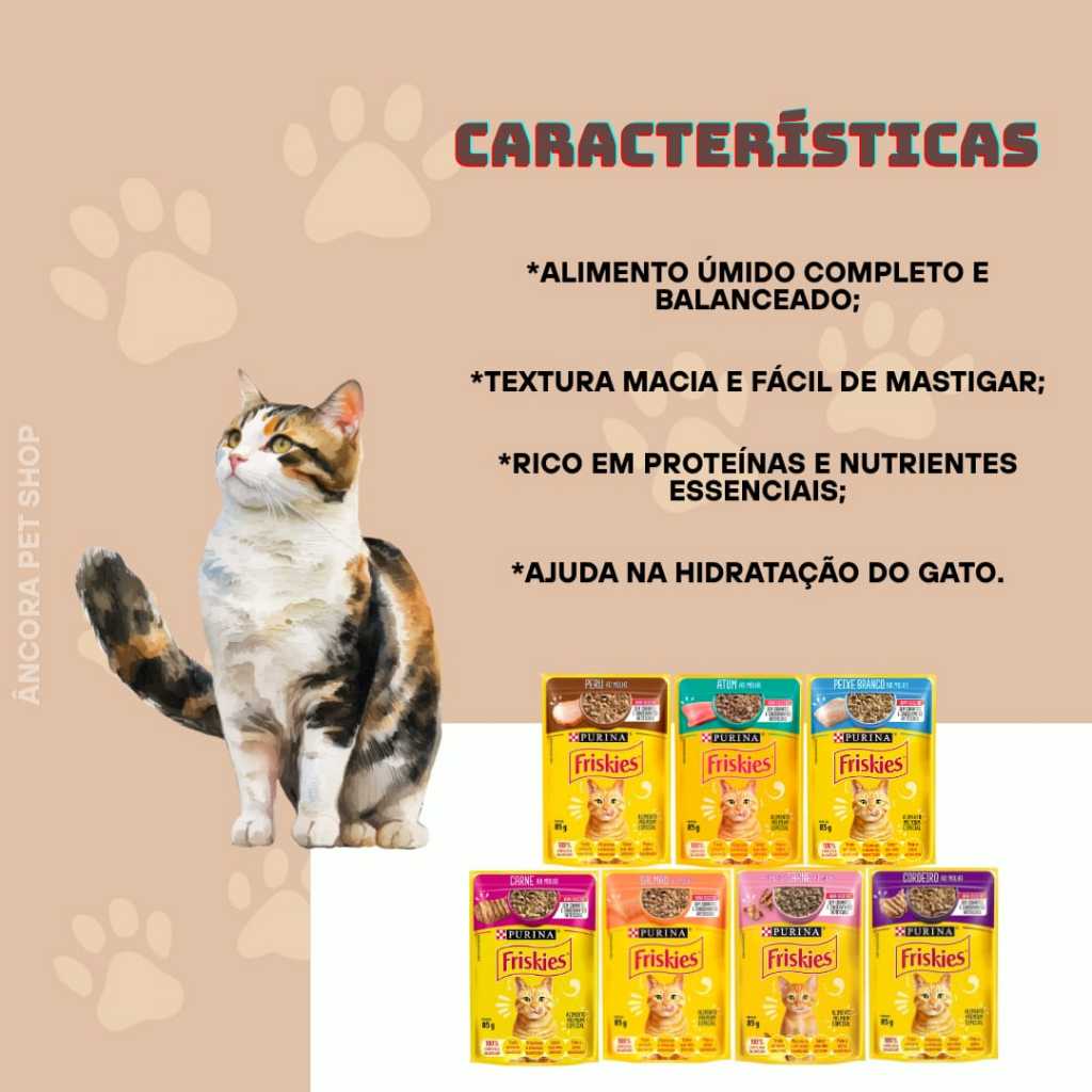 Friskies Sachê: variedade que agrada todos os miados! Benefícios Promove uma alimentação mais saborosa e variada; Contribui para a saúde da pele e pelagem; Ajuda na digestão com ingredientes de alta qualidade; Estimula o apetite de gatos seletivos. Características Alimento úmido completo e balanceado; Textura macia e fácil de mastigar; Rico em proteínas e nutrientes essenciais; Ajuda na hidratação do gato. Você sabia? Friskies Sachê é desenvolvido com ingredientes selecionados e sabor irresistível para agradar até os gatos mais exigentes. Além de sabor, oferece nutrição completa e ajuda na hidratação — essencial para gatos que bebem pouca água! Perguntas Frequentes com Respostas O sachê Friskies é alimento completo ou só petisco? R: É um alimento completo e balanceado, ideal para refeições diárias. Quantos sachês posso dar por dia? R: Depende do peso e idade do gato. Em média, 2 a 3 sachês por dia para gatos adultos. Precisa misturar com ração seca? R: Não é obrigatório, mas pode ser combinado para variar a dieta. Pode ser armazenado depois de aberto? R: Sim, mas deve ser refrigerado e consumido em até 48 horas.