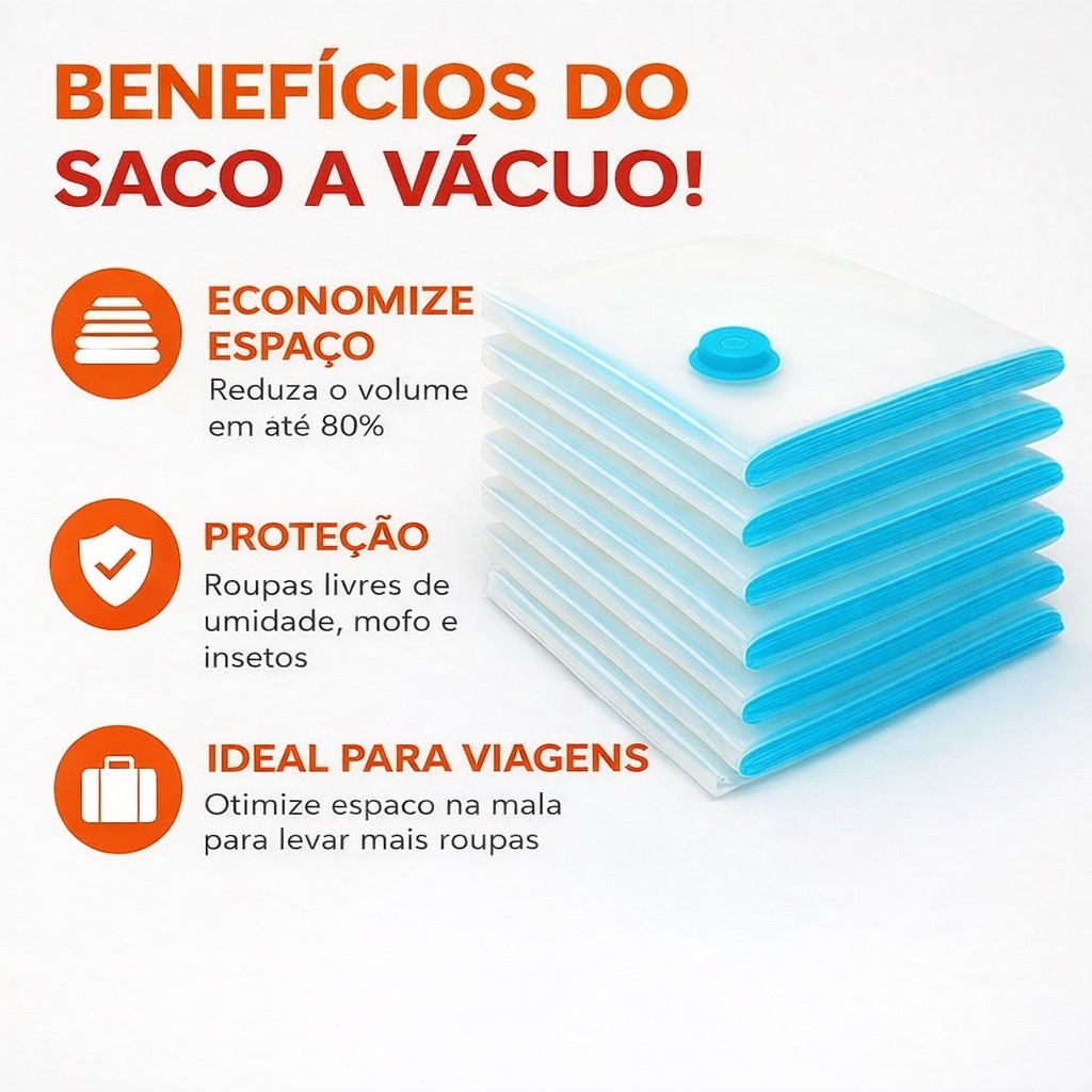 O Kit Saco a Vácuo é a solução ideal para você economizar espaço e proteger seus pertences de forma eficiente. Com este tamanho extra grande, é perfeito para guardar itens volumosos como edredons, cobertores, travesseiros, casacos pesados e roupas de inverno, otimizando o espaço em seu armário, closet ou malas de viagem. Benefícios Incríveis Economia de Espaço: Reduz o volume dos itens em até 80%, multiplicando o espaço de armazenamento disponível na sua casa ou bagagem. Proteção Total: Cria uma vedação hermética que protege suas roupas e têxteis contra mofo, umidade, poeira, insetos e odores. Seus pertences ficam limpos e conservados por muito mais tempo. Organização Simplificada: Ajuda a manter seu guarda-roupa organizado e seus itens sazonais ou de viagem perfeitamente compactados. Reutilizável: Fabricado com material resistente, pode ser usado e reutilizado inúmeras vezes. Facilidade de Uso Usar o Saco a Vácuo é extremamente simples e rápido: Abra e Encha: Abra o zíper duplo do saco e coloque os itens a serem compactados. Feche a Vedação: Feche o zíper completamente, garantindo que não haja aberturas. Retire o Ar: Remova a tampa da válvula e use a bomba manual inclusa para sugar o ar do interior do saco. Você verá o volume dos seus itens diminuir em segundos! Feche a Válvula: Recoloque a tampa na válvula para selar o vácuo. Pronto KIT SACO VACUO INCLUI 04 UNIDADES DE SACO SENDO: 01 UNIDADE TAMAMHO 40 X60 01 UNIDADE TAMAMHO 50 X 70 01 UNIDADE TAMAMHO 60 X 80 01 UNIDADE TAMAMHO 80 X 10