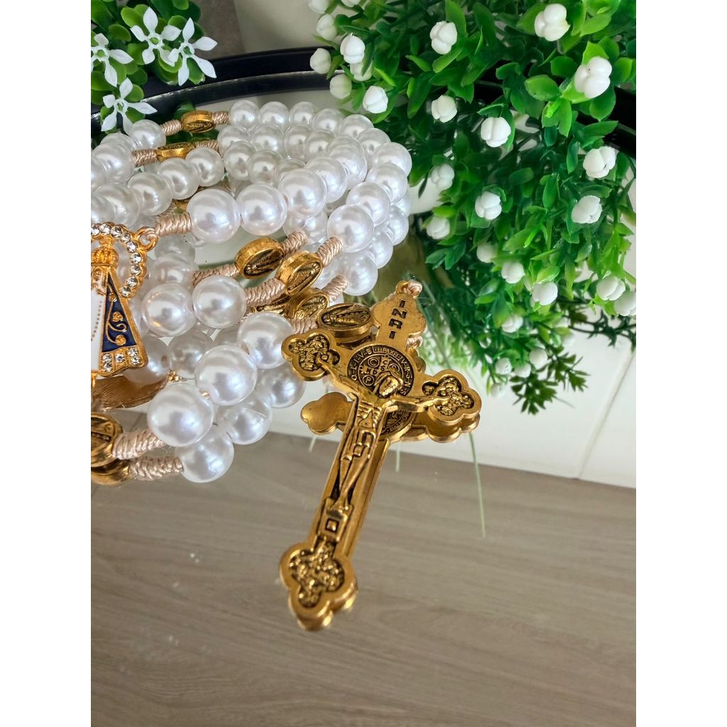 Kit Sagrada Família 15cm + Nossa Senhora 15cm + Terço de Nossa Senhora Perolado