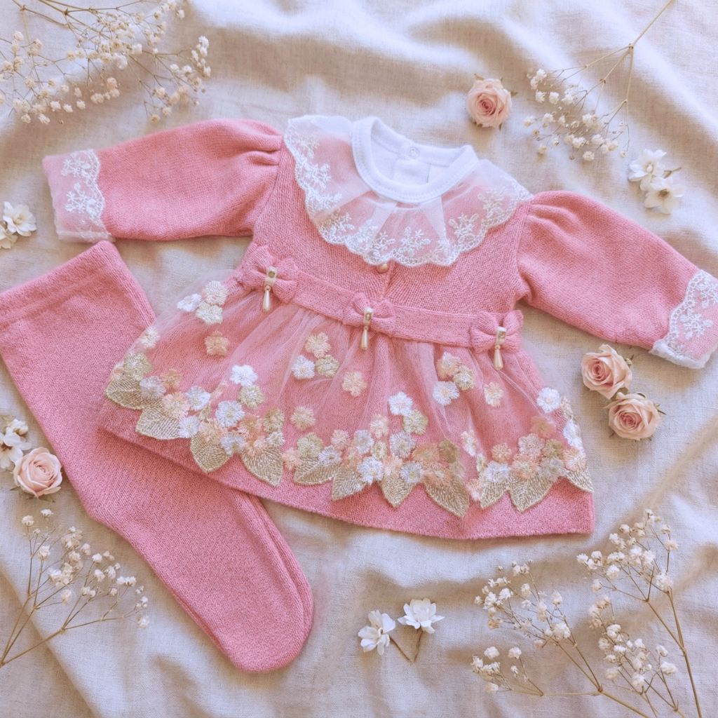Kit Saida de Maternidade Menina Vestido Tricot Recem Nascido 3 Peças 0 a 1 mês
