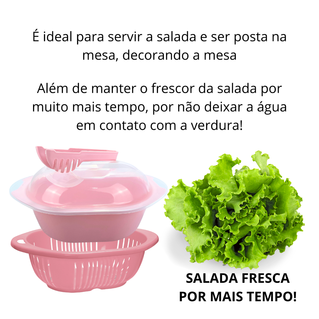 Kit com Saladeira e Escorredor de Salada de 3 litros com Tampa e Pegador. Produto de plástico injetado, serve de pote com pegador de salada, legumes, macarrão, carne, frutas, dentre outras comidas, sejam quentes ou frias. Alta qualidade, resistente e versátil. Acompanha tampa e pegador, ainda com escorredor de alimentos, com alças para facilitar a lavagem dos alimentos, havendo aberturas suficientes para escorrer toda a agua, mas também não permitindo o perdimento de alimentos. Pode ser utilizado tanto para comida fria ou quente, como escorredor de macarrão, escorredor de arroz, de feijão e diversas outras utilidades. Produto essencial para sua cozinha. Indispensável para sua casa, diferente dos outros, durando muito tempo na sua cozinha, com plástico que não pega cheiro da comida e não mancha. Produto 100% Brasileiro e de loja 100% online. Detalhes do Produto: - Compõe Saladeira com Tampa e Pegador e Escorredor - Cor ROSA Características do produto: Cumprimento: 32cm Largura: 22cm Altura: 15cm Material: Polipropileno Vendida pela minha família para sua família!! ------------------------------------------------- TAGS: Saladeira com Tampa e Pegador; Multiuso; Tigela de Cozinha; Pote de Cozinha; Pote com Tampa; Pote de Plástico; Recipiente Organizador; Utensílios de Cozinha; Utilidades domésticas; Pote; Pote de Comida; Pote de Marmitex; Vasilha de Comida; Escorredor de salada; escorredor de macarrão; escorredor de arroz; escorredor de feijão; lava tudo; Livre de BPA; lava comidas; Utensílios de Cozinha; Utilidades domésticas; lavador de alimentos; escorredor de comida; cumbuca; potes;