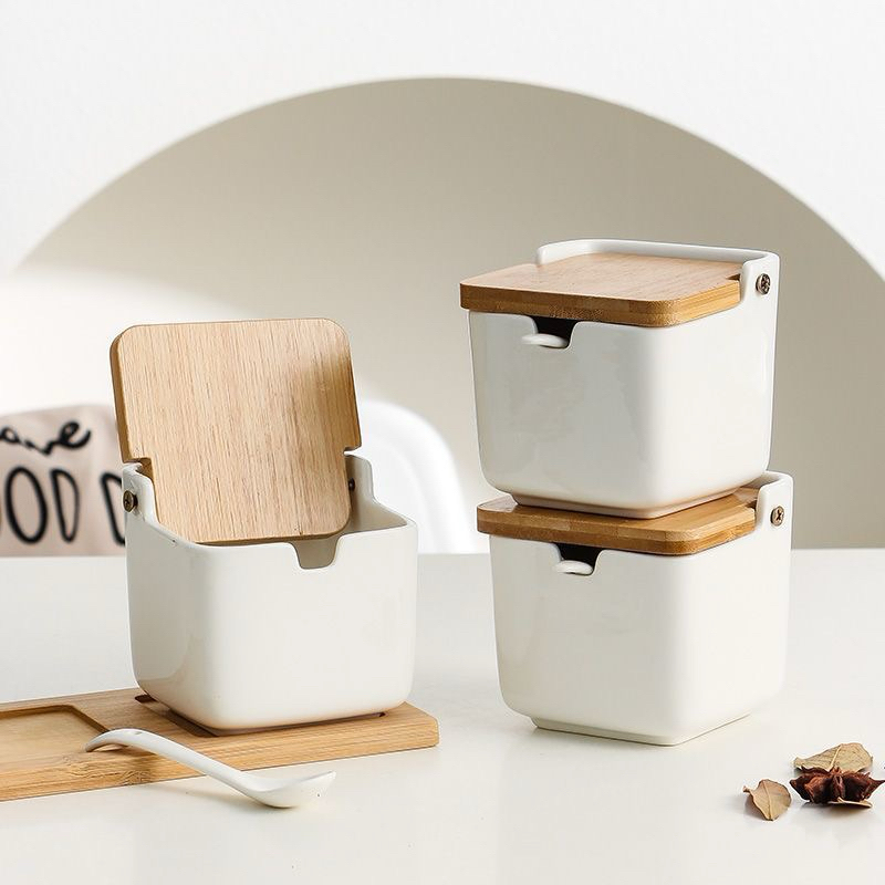 kit Saleiro Porta Sal Saleira de Porcelana Tampa de Bambu Mesa 9x8,5cm Bancada com Colher Lyor Pimenteiro Açucareiro