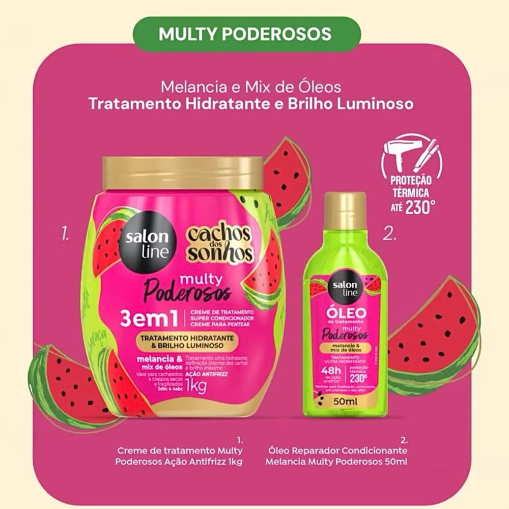 O Kit Kit Salon Line Multy Poderosos Creme de Tratamento 3 em 1 + Óleo Reparador Melancia promove hidratação profunda, definição intensa dos cabelos e controle máximo do frizz . Sua fórmula é enriquecida com óleo de melancia, mix de óleos, glicerina vegetal e provitamina B5 , que garantem nutrição, brilho e maciez aos fios. Contém no kit:1- Creme 3 em 1 Salon Line Cachos Dos Sonhos Multy Poderosos Melancia 1kg1- Óleo Reparador Salon Line Multy Poderosos Ação Antifrizz Cachos Dos Sonhos 50ml Benefícios:Ultra-hidratação para fios maciosDefinição intensa dos cachosBrilho radiante e ação antifrizzMaciez e desembaraço instantâneo Modo de usar: Creme de tratamento 3 em 1:Máscara de Tratamento: Aplique nos cabelos limpos e úmidos, enluvando mecha a mecha. Deixe agir por 5 minutos e enxágue bem.Condicionador: Após a lavagem, aplique nos fios úmidos, massageie e enxágue.Creme para Pentear: Com os cabelos limpos e úmidos, aplique uniformemente no comprimento e nas pontas. Desembarace com um pente de dentes largos e acumule os fios das pontas até a raiz. Não enxágue. Óleo Reparador:Com o cabelo seco ou úmido, aplique algumas gotas do óleo reparador na palma das mãos e espalhe bem do comprimento às pontas. Finalize como preferir. Sem enxágue. Sobre a marca: Com mais de 15 anos de atuação no mercado, a Salon Line é uma das maiores fabricantes de cosméticos do Brasil. A marca investe constantemente em tecnologia e inovação, oferecendo produtos de alta qualidade para atender às diversas necessidades dos cabelos brasileiros.