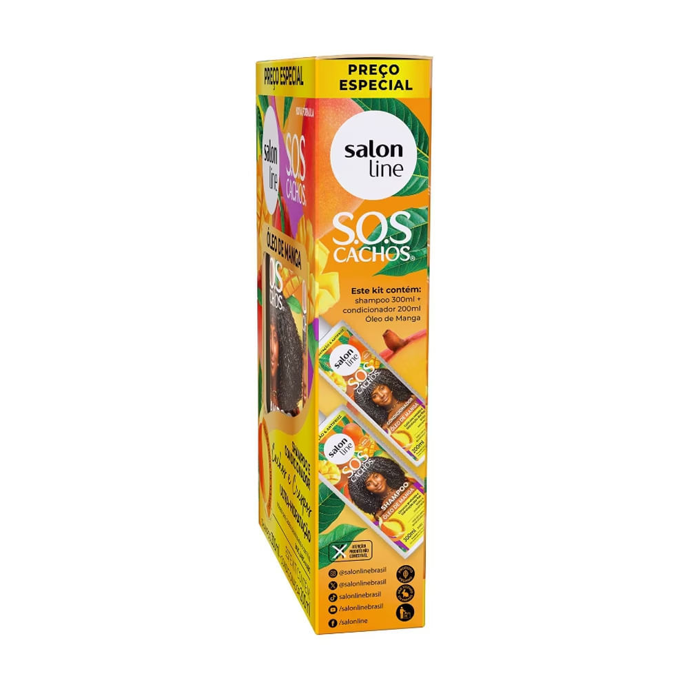 O Kit Salon Line Shampoo 300ml + Condicionador 200ml SOS Cachos Óleo De Manga limpa suavemente enquanto hidrata, devolve o brilho e maciez extra aos cabelos opacos e ressecados. Formulado com Óleo de manga que é rico em vitaminas para o cabelo e sais minerais, os benefícios da manga incluem ação hidratante e nutritiva, fortalecimento dos fios, brilho intenso e cabelos macios, e Queratina que é excelente para uma reconstrução capilar profunda, devolve os nutrientes que o cabelo perde ao longo do tempo. Benefícios:- Hidratação intensa e reparação: O óleo de manga nutre profundamente os fios, deixando-os hidratados e restaurados.- Definição dos cachos: Proporciona cachos mais definidos, sem pesar, e com movimento natural.- Brilho e maciez: Deixa os fios sedosos e com brilho radiante.- Controle do frizz: Reduz o frizz, proporcionando cachos mais alinhados e disciplinados.- Fórmula sem sulfato: Limpa suavemente, respeitando a estrutura capilar e garantindo cabelos saudáveis. Modo de usar: Shampoo: Aplique no cabelo úmido, massageie e enxágue. Se necessário, repita a aplicação.Condicionador: Aplique no cabelo úmido e espalhe uniformemente. Deixe agir entre 1 e 3 minutos. Enxágue bem por toda a extensão dos fios. Sobre a marca: Salon Line, uma das maiores fabricantes de cosméticos do Brasil, acompanha a evolução da mulher brasileira há mais de 15 anos. Toda essa vivência faz da empresa uma profunda conhecedora do universo feminino. A Salon Line está sempre investindo em novas tecnologias e produtos para oferecer o que há de melhor no segmento cosmético mundial. Empresa 100% Nacional, tem como objetivo especializar-se na beleza das mulheres brasileiras, desenvolvendo produtos de alta tecnologia e valorizando todas as belezas.