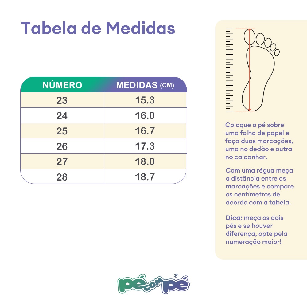 O kit com 3 pares da marca Pé com Pé é ideal para acompanhar as crianças em todos os momentos com conforto e estilo. Ele inclui um tênis esportivo rosa com fecho em velcro e detalhes em azul, uma sandália linda com tiras coloridas trançadas, perfeita para looks alegres, e uma sandália injetada branco com alça rosa, leve e prático para o dia a dia. Todos os calçados possuem design anatômico, são fáceis de calçar e feitos com materiais que proporcionam segurança e bem-estar para os pequenos. Um kit versátil que une praticidade e diversão em cada passo! *** ATENÇÃO *** Gentilmente solicitamos, sempre antes da compra, conferir as medidas na tabela abaixo conforme o comprimento do pé da criança. COMO MEDIR: Desenhe o pé da criança em uma folha, risque na posição do começo do calcanhar, e na frente do dedão e utilize a medida entre os dois. TABELA DE MEDIDAS: TÊNIS--Medida(cm) Nº 23--15.3 cm Nº 24--16.0 cm Nº 25--16.7 cm Nº 26--17.3 cm Nº 27--18.0 cm SANDÁLIA--Medida(cm) Nº 23 --- 15.3 cm Nº 24 --- 16.0 cm Nº 25 --- 16.7 cm Nº 26 --- 17.3 cm Nº 27 --- 18.0 cm BABUCHE--Medida(cm) Nº 23/24--16.0 cm Nº 25/26--17.3 cm Nº 27/28--18.7 cm *** PÉ COM PÉ - CONCEITOS DE MENINOS E MENINAS *** A Pé com Pé é uma Marca especializada em calçados infantis masculinos e Femininos. A marca projeta através de suas coleções uma criança moderna, atual e com personalidade. Tudo seguindo as tendências internacionais de moda e com combinações de cores incríveis! Nossos produtos têm design exclusivo e perfeito ajuste aos pés das crianças, garantindo conforto e bem estar. A combinação de looks com os calçados Pé com Pé garantem muito mais charme e elegância para quem já é um príncipe ou princesa para a família. Qualidade comprovada em cada detalhe! Nossa marca está passo a passo com os sonhos das crianças! Qualquer dúvida entre em contato conosco. Estamos à disposição!