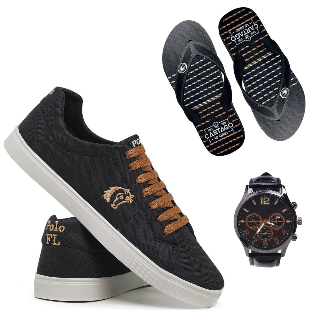 Kit Sapatenis Masculino Casual Polo Fl + Chinelo e Relogio