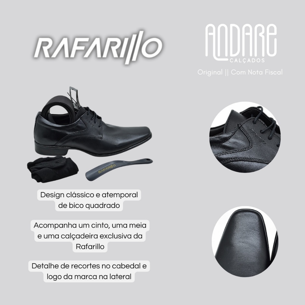 FORMA: Anatômica (ver tabela de medidas) CABEDAL: Couro legítimo, detalhe texturizado e pin metálico PALMILHA: Anatômica acolchoada, absorve impactos FECHAMENTO: Slip On com elástico lateral SOLADO: Borracha de alta qualidade, frisos antiderrapantes INTERIOR: Forrado em PU macio e antitranspirante ESTILO: Social elegante, bico quadrado clássico SALTO: Baixo e discreto CONTEÚDO DA CAIXA: 1 par de sapatos + meia + cinto GARANTIA: 30 dias contra defeitos de fabricação ENVIO: Caixa original do fabricante O Sapato Masculino Social Rafarillo em Couro é a escolha ideal para quem busca sofisticação, praticidade e conforto no dia a dia. Com um design elegante e atemporal, o modelo é versátil e pode ser usado em diversas ocasiões, como compromissos de trabalho, eventos formais ou encontros sociais, sempre agregando estilo e exclusividade ao visual masculino. Confeccionado em couro legítimo de altíssima qualidade, o calçado garante resistência, durabilidade e acabamento refinado. Sua confecção segue os padrões de excelência da Rafarillo, proporcionando um produto premium, desenvolvido para manter sua beleza e estrutura mesmo após longos períodos de uso. Seu design é clean e minimalista, com linhas modernas e discretas que reforçam a sofisticação. O destaque fica para a logo da marca aplicada de forma elegante na lateral do cabedal, transmitindo autenticidade sem perder a discrição. Para complementar, o kit acompanha uma meia exclusiva e um cinto confeccionado em couro sintético da Rafarillo, itens que tornam o conjunto ainda mais prático e completo. O modelo possui fechamento por cadarços, que proporciona ajuste firme e seguro, garantindo estabilidade e confiança durante todo o uso. O formato clássico com bico quadrado reforça a sofisticação e torna o calçado indispensável para composições formais e sociais. O interior é totalmente forrado e acolchoado em material PU antitranspirante, mantendo os pés secos e confortáveis mesmo em longos períodos de uso. A palmilha anatômica e macia garante absorção de impactos, oferecendo bem-estar e suavidade a cada passo. Com salto baixo e discreto, o sapato equilibra perfeitamente conforto e estilo, atendendo às exigências do dia a dia sem abrir mão da elegância que a ocasião pede. Para finalizar, o solado é confeccionado em borracha de alta qualidade, com frisos antiderrapantes que proporcionam aderência, tração e segurança em diferentes superfícies. Essa construção garante estabilidade, firmeza e durabilidade, tornando o sapato uma escolha confiável e sofisticada para qualquer momento. TABELA DE MEDIDAS Tamanho 37 - 26cm Tamanho 38 - 26,6cm Tamanho 39 - 27,3cm Tamanho 40 - 28cm Tamanho 41 - 28,6cm Tamanho 42 - 29,3cm Tamanho 43 - 29,9cm Tamanho 44 - 30,6cm