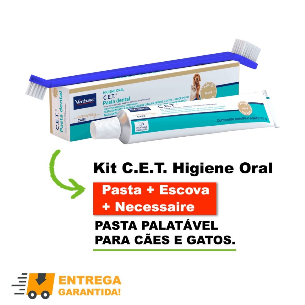 Catalogado na subcategoria Cuidados Orais (de Animais Domésticos), Kit Saúde Oral com Escova Cães e Gatos Pasta CET Virbac está à venda na Shopee Brasil por R$ 139,99 (26% de desconto sobre o preço original de R$ 189,18).