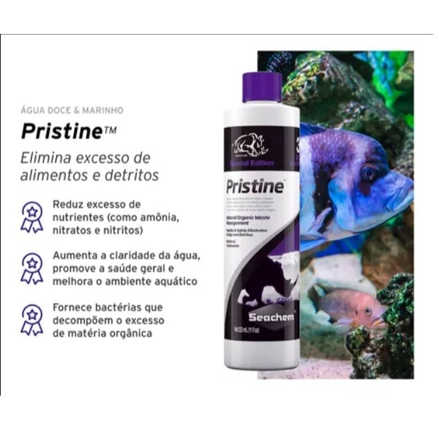 Kit Seachem Prime, Stability e Pristine 325ml = 1 unidade de cada PRIME 325ml Seachem Prime é utilizado para o tratamento de água, auxiliando na desintoxicação completa dos metais pesados e tóxicos encontrados na água da torneira. Prime é um condicionador completo e concentrado para água doce e salgada. Remove cloro, cloramina e neutraliza amônia, convertendo a amônia em uma forma segura e não tóxica que facilmente é removida pelo biofiltro do aquário. O condicionador pode ser utilizado durante a ciclagem para aliviar a toxicidade de amônia/nitrito. Ele também irá desintoxicar todos os metais pesados encontrados na água da torneira em níveis de concentração típicos. Prime não é ácido e não impactará o pH, nem irá sobrecarregar o skimmer. Use no início do aquário e sempre quando for repor a água do seu aquário. STABILITY 325ml Stability estabelecerá rapidamente o biofiltro do aquário em sistemas de água doce e marinho, evitando assim a causa número 1 de morte dos peixe: síndrome do novo tanque. Stability é formulado especialmente para o aquário e contém uma mistura sinérgica de bactérias aeróbias, anaeróbias e outras que facilitam a degradação de resíduos orgânicos, amônia, nitrito e nitrato. As bactérias empregadas pelo Stability são não fixadoras de enxofre e não produzirão sulfeto de hidrogênio tóxico. O produto completamente inofensivo para todos os organismos aquáticos e plantas aquáticas, não havendo perigo no uso excessivo. PRISTINE 325ml Pristine utiliza bio-aumento, um método não químico e natural, para melhorar a qualidade da água. Ele fornece as bactérias que decompõem o excesso de alimentos, resíduos e detritos em sistemas de água doce e marinhos. Ele também irá reduzir o excesso de nutrientes (por exemplo, amônia, nitratos e nitritos) que podem estimular o crescimento de organismos incômodos e organismos causadores de doenças. Aumenta a claridade da água e promove a saúde geral, melhora o ambiente aquático.