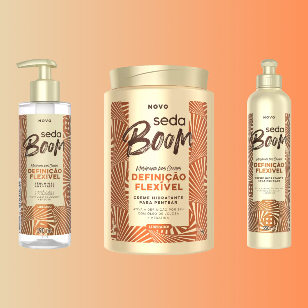 O que vem no kit Seda Boom Definição Flexível A linha é específica para finalização de cachos com definição, leveza e movimento, e atualmente inclui ao menos dois produtos principais: Creme Hidratante para Pentear (Creme de Pentear) Proporciona definição por até 24 horas, com elasticidade e balanço natural, sem pesar nos fios. Enriquecido com Óleo de Jojoba (brilho e maciez) e Queratina (elasticidade e resistência) Seda Fórmula liberada (sem petrolatos, parabenos, silicone ou óleo mineral), ideal para cabelos cacheados e ondulados Versões disponíveis: frascos de 350 ml e potes grandes de 1 kg Fragrância duradoura, com perfume que pode durar até 72 horas Sérum-Gel Anti-Frizz Finalizador leve com textura sérum aquosa que traz brilho e elasticidade aos cachos, com fixação suave e duradoura Com ingredientes como Babosa (hidratante) e Óleo de Jojoba (brilho e maciez) Também liberado, sem petrolatos, parabenos, silicones ou óleo mineral Disponível em versão de 190 ml A linha Seda Boom Definição Flexível foi desenvolvida especialmente para realçar a beleza natural dos cachos, proporcionando definição duradoura com movimento e leveza. Sua fórmula contém óleo de coco e filtro UV, que ajudam a nutrir e proteger os fios contra o ressecamento, mantendo os cachos sempre hidratados, macios e com brilho radiante. Ideal para quem busca controle do frizz sem perder a naturalidade, essa linha garante cachos soltos, maleáveis e bem definidos ao longo do dia. ✅ Definição flexível, sem rigidez ✅ Cachos hidratados, leves e cheios de movimento ✅ Fórmula com óleo de coco e filtro UV ✅ Proteção contra ressecamento e frizz