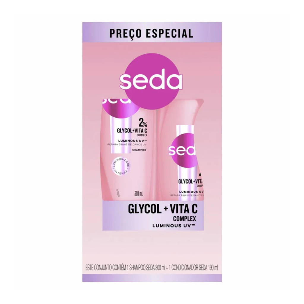 Kit Seda Luminous UV Shampoo 300ml + Condicionador 190ml O Kit Seda Luminous UV foi desenvolvido para proporcionar um cuidado completo aos cabelos expostos diariamente ao sol e outras agressões externas. Com fórmula enriquecida com filtro UV, esse kit protege os fios contra os danos causados pela radiação solar, mantendo o brilho e a hidratação dos cabelos por muito mais tempo. Principais Características: - Proteção UV integradaContém filtro UV que ajuda a proteger os fios contra os danos solares, ideal para quem se expõe com frequência ao sol. - Fórmula hidratante e nutritivaMantém os cabelos macios e sedosos, mesmo após exposição a agentes externos como vento, calor e poluição. - Ação iluminadoraRealça o brilho natural dos fios e proporciona um visual radiante, sem pesar na raiz. Benefícios: - Proteção diária contra os raios solares - Cabelos mais brilhantes e nutridos - Sensação de leveza e maciez prolongada - Redução do ressecamento causado pelo sol - Ideal para todos os tipos de cabelo expostos a ambientes externos Diferenciais do Produto: - Filtro UV que protege os fios mesmo em dias ensolarados - Combinação perfeita entre hidratação e brilho - Fórmula leve e eficaz para uso diário - Dermatologicamente testado Especificações Técnicas: - Peso total do kit: 490g - Shampoo: 300ml - Condicionador: 190ml Instruções de Uso: - Aplique o shampoo nos cabelos molhados e massageie suavemente até formar espuma. Enxágue bem. - Em seguida, aplique o condicionador do comprimento até as pontas. Deixe agir por alguns minutos e enxágue abundantemente. Avisos e Precauções: - Uso externo. - Evite contato com os olhos. Em caso de contato, enxágue com água em abundância. - Manter fora do alcance de crianças. O que está incluso? - 1 unidade de Shampoo Seda Luminous UV 300ml - 1 unidade de Condicionador Seda Luminous UV 190ml ---- DÚVIDAS FREQUENTES ---- Os produtos são originais? Sim. Todos os nossos produtos são originais. Emitem nota fiscal? Sim. Emitimos nota fiscal para todos os pedidos.