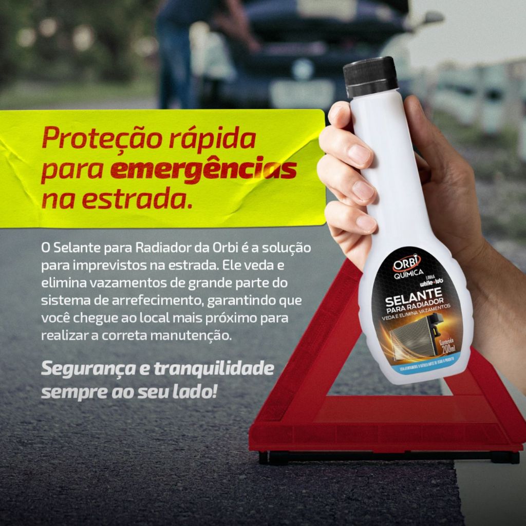 PRODUTO NACIONAL, QUALIDADE GARANTIDA! SELANTE PARA RADIADOR ORBI 200ML ✅Ideal para vedar e eliminar a maioria dos vazamentos em radiadores e na parte dos sistemas de refrigeração. ✅Mistura-se com qualquer tipo de líquido refrigerante. ✅Não prejudica a bomba d’água e válvula termostática. ✅Produto de ação rápida e segura MODO USAR: Remover a tampa do Sistema/Reservatório. Com o motor frio e após ter verificado instruções do manual do proprietário, drenar o sistema. Adicionar o LIMPA RADIADORES ORBI no sistema e completar com água. Recolocar a tampa. Após o motor atingir a temperatura de funcionamento, deixa-lo trabalhando por mais 10 minutos. Com o motor desligado e frio, repetir as ações de abertura e drenagem do sistema e fechar o dreno. Completar o sistema somente com água, e fazer o motor funcionar por mais 5 minutos. Retirar a água, drenando-a, feche o dreno e complete o sistema com fluido para radiadores,(Utilize as opções de produtos para arrefecimento da Linha ORBI, consulte as opções no site) conforme instruções do fabricante. Recolocando a tampa do radiador ou reservatório.