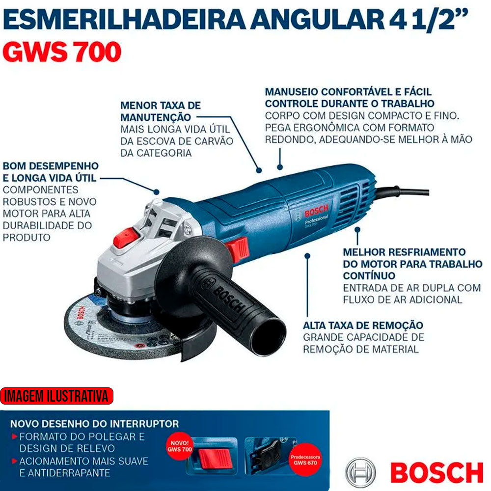 Esmerilhadeira Bosch GWS 700 — 710 W (127V ou 220V) O que está adquirindo 1 Esmerilhadeira Bosch GWS 700 — 710 W (versão 127V ou 220V, escolher conforme disponibilidade) 1 Punho auxiliar 1 Capa de proteção (protetor de disco) 1 Flange de apoio 1 Porca de aperto 1 Chave de aperto 1 Manual do usuário Descrição do produto A Esmerilhadeira Bosch GWS 700 é uma ferramenta profissional compacta e leve, com 710 W de potência e design ergonômico para excelente manuseio. Seu motor com escovas de longa vida útil, entrada dupla de ar e novo interruptor proporcionam melhor resfriamento, operação contínua e menor manutenção. Indicada para rebarbação, corte leve e desbaste com discos de até 115 mm. Principais características Potência de 710 W para aplicações de rebarbação e corte leve. Disponível em 127V ou 220V (escolher versão ao cadastrar/vender). Design ergonômico e pega otimizada para maior conforto. Dupla entrada de ar para melhor resfriamento do motor em trabalhos contínuos. Novo interruptor com formato ergonômico e acionamento antiderrapante. Componentes robustos e baixo custo de manutenção. Peso leve que facilita o manuseio em tarefas prolongadas. Acompanha punho auxiliar para controle e precisão. Especificações técnicas Marca: Bosch Professional Modelo: GWS 700 Potência nominal: 710 W Tensão: 127V ou 220V (escolher, quando disponível) Rotações nominais: 12.000 rpm Diâmetro máximo do disco: 115 mm Rosca do eixo de retificação: M14 (variações regionais podem apresentar rosca 5/8") Comprimento máximo da rosca do eixo: 12 mm Peso (EPTA / com punho adicional padrão): 1,7 kg Peso (EPTA / com punho adicional antivibração): 1,8 kg Peso (líquido): 1,6 kg Aplicações recomendadas Rebarbação e acabamento em metal. Corte e desbaste de peças metálicas com discos de até 115 mm. Trabalhos leves de preparação de superfície. Uso profissional em oficinas, serralherias e manutenção industrial. Segurança, uso e manutenção Use sempre EPI: óculos, luvas, máscara contra poeira e proteção auricular. Verifique o disco (integridade e tipo) antes de usar; utilize somente discos compatíveis com 115 mm e com rotação máxima =12.000 rpm. Travar o eixo antes de trocar flange/porca; usar a chave de aperto inclusa. Não operar sem a capa de proteção devidamente instalada. Manter entradas de ar limpas e secas para garantir resfriamento adequado. Desligar e desconectar da tomada antes de qualquer manutenção. Substituir escovas, discos e componentes desgastados conforme indicado no manual. SKU da Loja: 13072025 Garantia: 1 ano