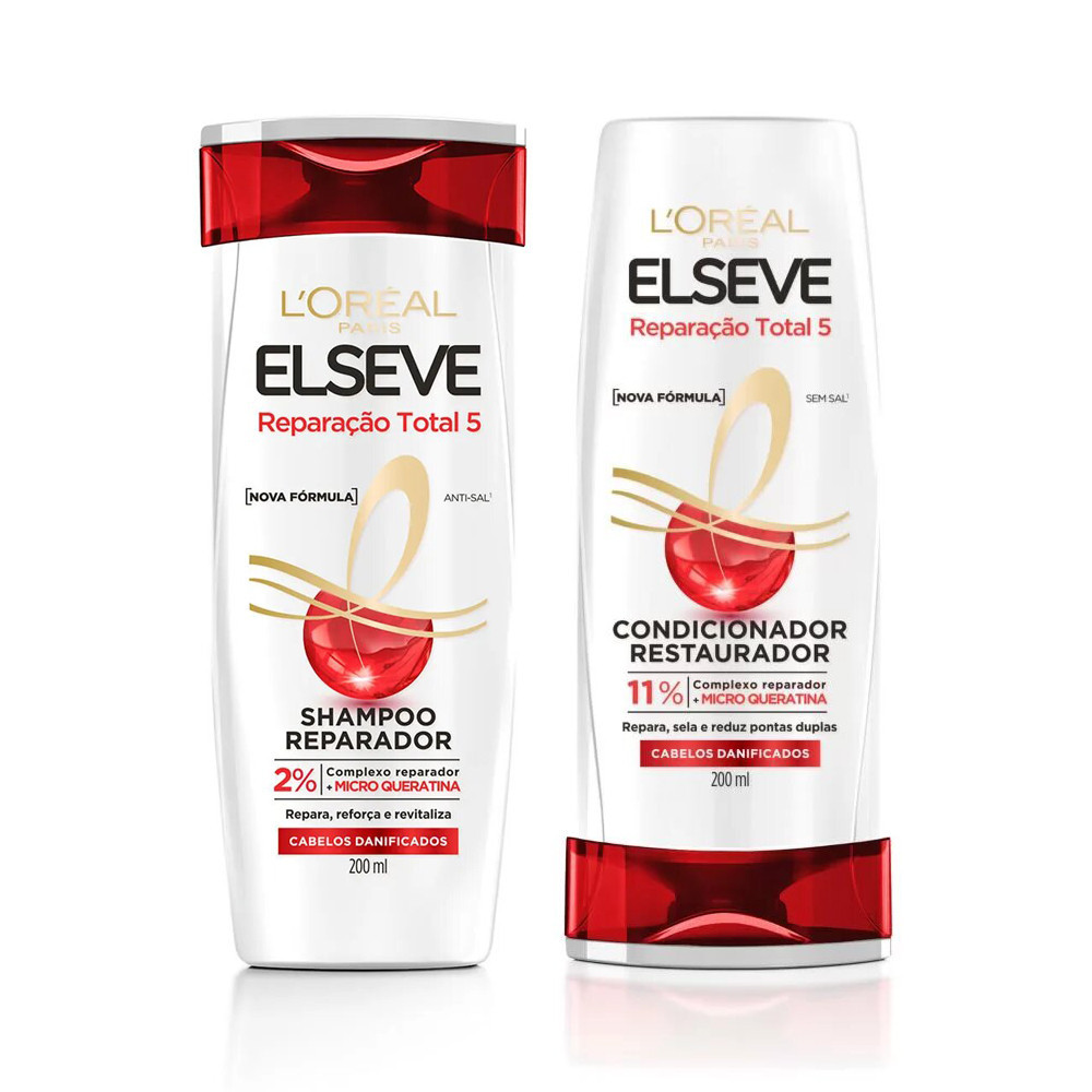 ESTE KIT CONTÉM 1 SHAMPOO REPARAÇÃO TOTAL 5 ELSEVE 200ML 1 CONDICIONADOR REPARAÇÃO TOTAL 5 ELSEVE 200ML A linha Reparação Total 5, totalmente reformulado, enriquecido com Cicatri-Ceramida identifica e cicatriza os 5 principais danos causados no dia a dia: quebra, rigidez, opacidade, ressecamento e ponta dupla. O cabelo fica reconstruído, transformado, reparado, macio e brilhante. Benefícios O Kit Elseve Reparação Total 5 é enriquecido com Cicatri-Ceramida que age combatendo os danos desde os primeiros sinais. - Sua fórmula ajuda a reduzir fios quebradiços, trazendo mais brilho e flexibilidade ao cabelo. - Remove as pontas duplas e recupera a estrutura da fibra deixando os fios uniformes, selados e protegidos como se fosse uma cicatrização da fibra capilar. Indicação A nova fórmula do Shampoo Elseve Reparação Total 5 é ideal para quem tem cabelo danificado e quer um efeito plastica capilar nos fios. Como usar Aplique o shampoo nos cabelos molhados e massageie suavemente. Enxágue. Repita a operação se necessário. Após lavar os cabelos com shampoo, aplique o condicionador em todo o comprimento até as pontas, deixe o produto agir por alguns minutos. Enxágue abundantemente.