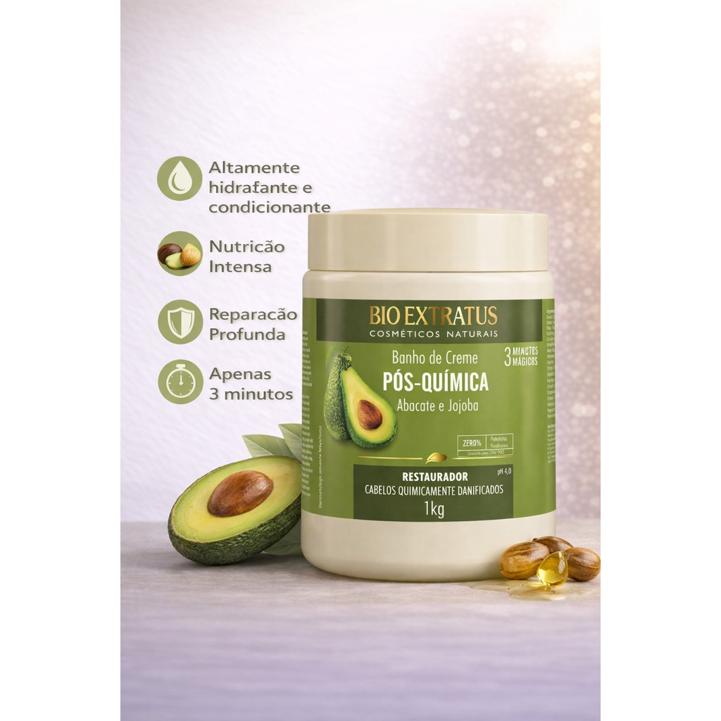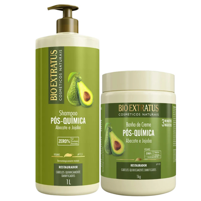 Kit Shampoo 1L + Máscara 1kg Pós Química Bio Extratus Para Cabelos Quimicamente Danificados 🥑💚 O tratamento perfeito para recuperar cabelos quimicamente tratados, danificados e ressecados. O Kit Pós-Química Bio Extratus promove limpeza equilibrada e reconstrução intensiva, devolvendo saúde, maciez e brilho aos fios após progressivas, colorações ou descolorações ✨ Enriquecido com Abacate e Jojoba, ativos altamente nutritivos que repõem lipídios, fortalecem a fibra capilar e ajudam a restaurar a resistência natural dos cabelos. 🌿 Benefícios ✔ 💧 Hidratação profunda ✔ 🥑 Nutrição intensa e reposição lipídica ✔ 🔄 Reparação da fibra capilar ✔ ✨ Brilho e maciez imediatos ✔ 🛡️ Reduz quebra e ressecamento ✔ 🌱 Produto vegano ✔ 🚫 Zero% (livre de ingredientes agressivos*) ✔ 💆♀️ Recupera cabelos pós-química 🧴 O KIT CONTÉM • Shampoo Pós-Química Abacate & Jojoba 1L • Banho de Creme Pós-Química Abacate & Jojoba 1kg 💆♀️ MODO DE USO Shampoo: Aplique nos cabelos molhados e massageie suavemente 🫧 Enxágue e repita se necessário 🚿 Banho de Creme: Após lavar, aplique do comprimento às pontas, massageando mecha a mecha. Deixe agir de 3 a 5 minutos ⏱️ Enxágue completamente. Indicado para cabelos fragilizados por química que precisam de tratamento intensivo e cuidado diário para voltarem a ficar fortes, sedosos e saudáveis 💛✨