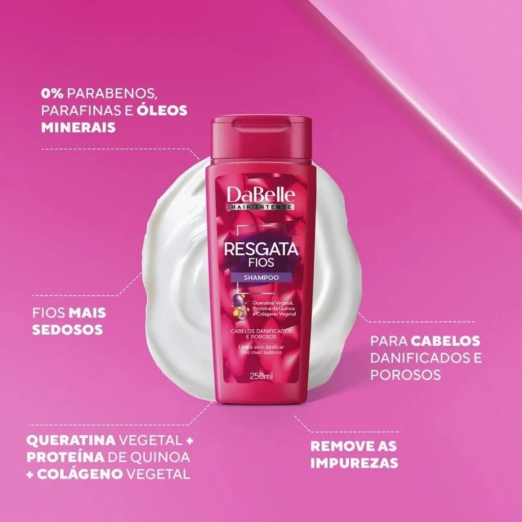 DaBelle Hair Intense Resgata Fios - Shampoo 250ml e DaBelle Hair Intense Resgata Fios - Condicionador 175ml. Shampoo 250ml: O Shampoo Resgata Fios remove as impurezas com delicadeza e prepara seus fios para os próximos passos do tratamento. DaBelle Hair Intense Resgata Fios. Condicionador 175ml: O Condicionador Resgata Fios alinha e sela as cutículas para intensificar o brilho e facilitar o desembaraço dos cabelos. É ideal para manutenção do tratamento e reconstrução. COMPLEXO RESGATE: ENRIQUECIDO COM VITAMINAS E e PRÓ-B5. QUERATINA VEGETAL: Poderoso reconstrutor, reestrutura, fortalece e repara os danos. PROTEÍNA DA QUINOA: Aumenta a resistência dos fios e previne contra danos futuros. COLÁGENO VEGETAL: Elimina a porosidade, devolve a maciez e recupera o brilho. 0% PARABENOS, PARAFINAS E ÓLEOS MINERAIS