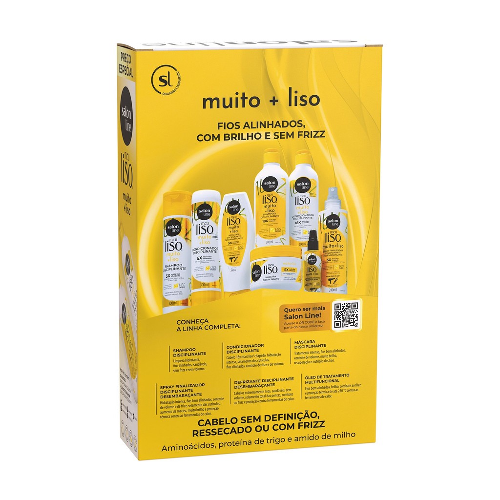 O Kit Meu Liso Muito + Liso, com Shampoo 300ml e Condicionador 200ml, garante limpeza, hidratação intensa e controle do frizz. Sua fórmula especial garante fios 18x mais liso, deixando os cabelos alinhados, brilhosos e com um toque macio. <>INDICAÇÕES$& Para quais tipos de cabelo? Liso e ondulado. Qual a indicação? Para cabelos sem definição, ressecados ou com frizz. Pode usar a partir de quantos anos? A partir de 12 anos. <>ATIVOS$& Quais os principais ativos? Conta com ingredientes que garantem ação intensa, resultado rápido e proteção contra danos externos. <>MODO DE USO$& Qual a melhor forma de usar? Shampoo Disciplinante Meu Liso Muito + Liso Aplique o shampoo no cabelo úmido, massageie e enxágue. Se necessário, repita a aplicação. Condicionador Disciplinante Meu Liso Muito + Liso Aplique o produto no cabelo úmido e espalhe uniformemente. Deixe agir entre 1 e 3 minutos. Enxágue bem por toda a extensão dos fios. <>CARACTERÍSTICAS$& É produto vegano? O Kit Meu Liso Muito + Liso é vegano. É liberado? O Kit Meu Liso Muito + Liso não é liberado.