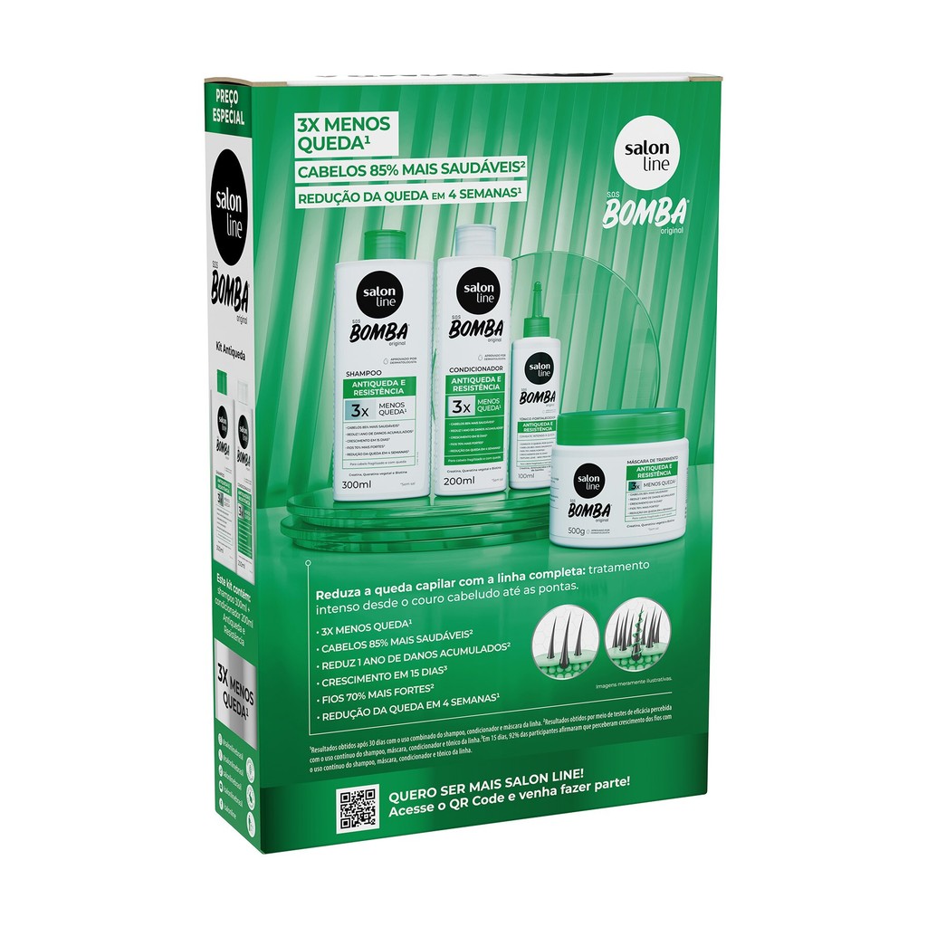 O Kit S.O.S Bomba Antiqueda, com Shampoo 300ml e Condicionador de 200ml, oferece limpeza hidratante e ajuda a recuperar a saúde dos cabelos, deixando os fios 85% mais saudáveis, 70% mais fortes e com 3x menos queda. Resultados comprovados em 4 semanas. Eficácia comprovada. <>INDICAÇÕES$& Para quais tipos de cabelo? Para todas as curvaturas. Qual a indicação? Para cabelos fragilizados e com queda. Pode usar a partir de quantos anos? A partir de 12 anos. <>ATIVOS$& Quais os principais ativos? Biotina: ajuda a diminuir a queda e estimula o crescimento do cabelo. Creatina: restaura e dá força aos cabelos. Queratina vegetal: restaura e hidrata, auxiliando na reconstrução dos fios. <>MODO DE USO$& Qual a melhor forma de usar? Shampoo Antiqueda Aplique o shampoo no cabelo úmido, massageie e enxágue. Se necessário, repita a aplicação. Condicionador Antiqueda Aplique o produto no cabelo úmido e espalhe uniformemente. Deixe agir entre 1 e 3 minutos. Enxágue bem por toda a extensão dos fios. <>CARACTERÍSTICAS$& É produto vegano? O Kit S.O.S Bomba Antiqueda é vegano. É liberado? O Kit S.O.S Bomba Antiqueda não é liberado.