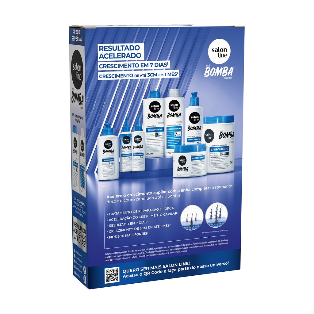 O Kit S.O.S Bomba Original Crescimento, com Shampoo 300ml e Condicionador 200ml, acelera o crescimento dos fios em até 7 dias, garantindo cabelos 30% mais fortes, reparados e hidratados. Fórmula poderosa e dermatologicamente testada. Eficácia comprovada. <>INDICAÇÕES$& Para quais tipos de cabelo? Para todas as curvaturas. Qual a indicação? Para cabelos fragilizados e com dificuldade de crescimento. Pode usar a partir de quantos anos? A partir de 12 anos. <>ATIVOS$& Quais os principais ativos? Whey protein: restaura as fibras capilares danificadas Vitamina A: fortalece os fios e auxilia no crescimento saudável. D-pantenol: hidrata e melhora a textura da fibra, combatendo as pontas duplas. Biotina: ajuda a diminuir a queda e estimula o crescimento do cabelo. Óleo de rícino: restaura e hidrata os fios, além de cuidar do couro cabeludo. <>MODO DE USO$& Qual a melhor forma de usar? Shampoo S.O.S Bomba Original Crescimento Aplique o shampoo no cabelo úmido, massageie e enxágue. Se necessário, repita a aplicação. Condicionador S.O.S Bomba Original Crescimento Aplique o produto no cabelo úmido e espalhe uniformemente. Deixe agir entre 1 e 3 minutos. Enxágue bem por toda a extensão dos fios. <>CARACTERÍSTICAS$& É produto vegano? O Kit S.O.S Bomba Original Crescimento não é vegano. É liberado? O Kit S.O.S Bomba Original Crescimento não é liberado.