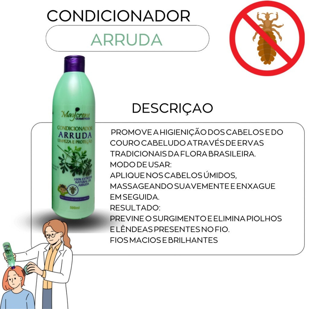 Shampoo de Arruda Promove a Higienição dos Cabelos e do Couro Cabeludo através de ervas tradicionais da Flora Brasileira. Modo de Usar: Aplique nos cabelos úmidos, massageando suavemente e enxague em seguida. Resultado: Previne o surgimento e elimina Piolhos e Lêndeas presentes no fio. Fios Macios e Brilhantes Conteúdo da Embalagem: * Produto disponível, a pronta entrega!! Finalidade: Shampoo - O shampoo 100% Extrato Natural de Arruda da Maycrene cosméticos limpa os cabelos deixando-os saudáveis, possui uma fórmula que promove a higiene dos cabelos e couro cabeludo deixando-os limpos e livre de coceira. Condicionador - O condicionador 100% Extrato Natural de Arruda da Maycrene cosméticos hidrata os fios preservando a saúde do couro cabeludo. Modo de usar: Shampooo- Aplique o shampoo nos cabelos ainda secos e massageie o couro cabeludo. Coloque uma touca plástica e aguarde 20 minutos. Enxágue em seguida. Condicionador- Aplique nos cabelos úmidos, massageie suavemente enxágue em seguida. Finalidade: Promove a hidratação dos cabelos deixando-os macios e brilhantes através da combinação de ervas e plantas tradicionais da flora brasileira. Contém: 01- Shampoo 100% Extrato Natural de Arruda da Maycrene cosméticos - 500 mL; 01- Condicionador 100% Extrato Natural de Arruda da Maycrene cosméticos; 500ml