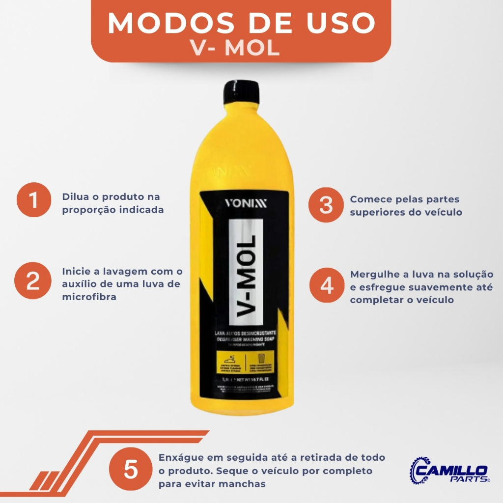 PRODUTO NOVO Quer uma limpeza completa e profissional para o seu carro? Características do Produto – Kit com 2 shampoos automotivos Vonixx – V-Floc 1,5L: shampoo pH neutro, alta lubrificação e rendimento – V-Mol 1,5L: desincrustante biodegradável, pH levemente básico – Remove sujeiras difíceis como barro e óleo – Seguro para pintura, ceras e selantes – Fórmulas de alta performance Por que escolher este produto – Limpeza suave e profunda ao mesmo tempo – Rende várias lavagens, até 300 veículos pequenos – Reduz riscos na pintura graças à lubrificação – Produtos Vonixx, referência em estética automotiva – Praticidade e economia em um único kit Dicas de Uso – Para sujeiras leves, utilize o V-Floc diluído – Para sujeiras mais pesadas, utilize o V-Mol – Aplicar com luva de microfibra ou esponja macia – Lavar sempre de cima para baixo – Evitar aplicar sob sol forte Perguntas Frequentes – O kit pode ser usado em motos? Sim, os produtos são indicados para carros e motos. – O V-Floc remove ceras da pintura? Não, ele é pH neutro e preserva ceras e selantes. – O V-Mol pode manchar a pintura? Não, quando diluído e usado corretamente, é seguro. Mantenha seu carro sempre limpo, protegido e brilhando com o kit Vonixx.