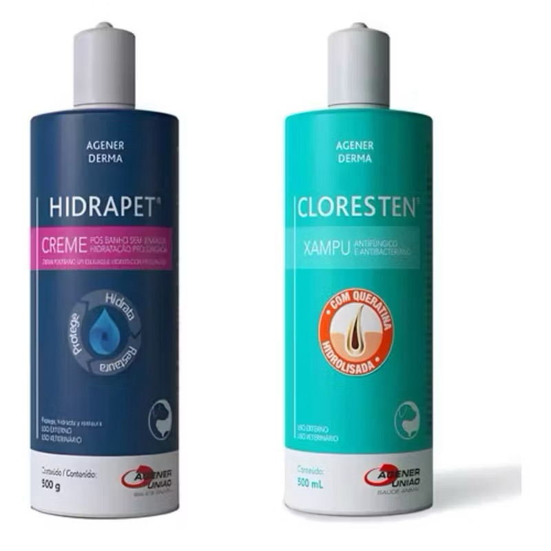 Shampoo Cloresten 500ml Agener União - Indicado para cães e gatos; - Ideal para tratamento e prevenção de dermatites; - Age contra infecções causadas por bactérias e fungos, Infelizmente, muitos pets sofrem com problemas de pele causados por bactérias e fungos. No entanto, para que seu companheiro não seja um deles, contar com o shampoo Cloresten será um ótimo aliado na hora da higiene. O produto trata e também previne a proliferação das bactérias que podem causar infecções. E, além disso: - Mantém seu pet limpo e cheiroso; - Pode ser usado de uma a duas vezes na semana; - Não causa alergia, - Proporciona maciez e brilho aos pelos. Creme Hidratante Agener União Hidrapet 500ml - A base de óleo de macadâmia, ceramida e combinação de silicones; - Indicado para a hidratação da pele e dos pelos de cães e gatos; - Proporciona aos pelos maciez, volume, brilho, resistência e vigor; - Facilidade de desembaraço. O Creme Hidratante AGENER UNIÃO Hidrapet é um creme pós-banho a base de óleo de macadâmia, ceramida e combinação de silicones, indicado para a hidratação da pele e dos pelos de cães e gatos. Proporciona aos pelos maciez, volume, brilho, resistência e vigor. Facilidade de desembaraço.