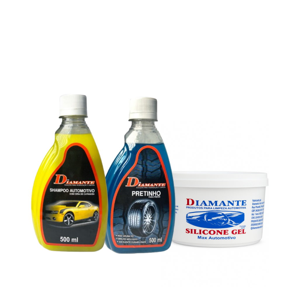 KIT Shampoo com cera de carnaúba 500ml + Silicone em Gel 600g + Pretinho Para Pneus 500ml