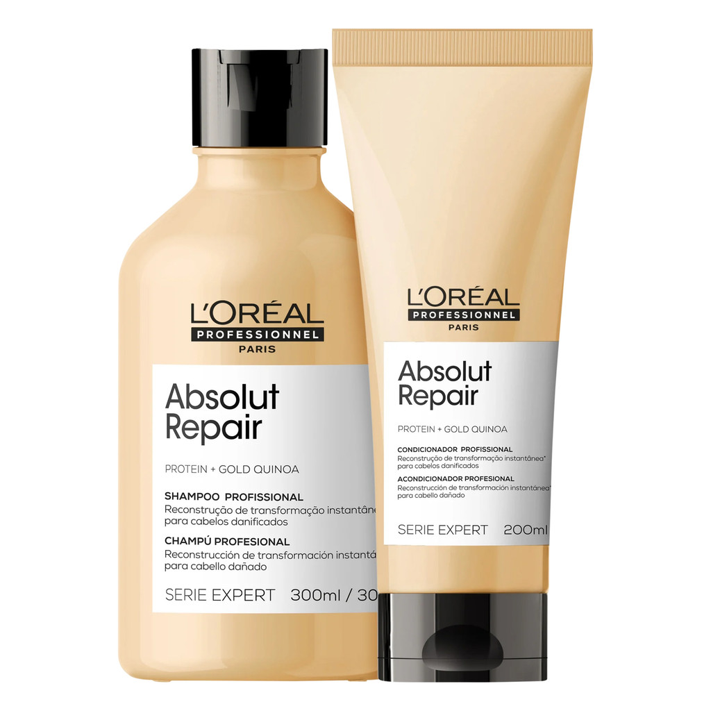 ESTE KIT CONTÉM: 1 SHAMPOO ABSOLUT REPAIR LORÉAL PROFESSIONNEL SERIE EXPERT 300ML 1 CONDICIONADOR ABSOLUT REPAIR LORÉAL PROFESSIONNEL SERIE EXPERT 200ML Shampoo de tratamento da linha Absolut Repair Gold Quinoa contém quinoa dourada e proteína de trigo. A fórmula profissional repara e nutre instantaneamente os fios e proporciona um cabelo mais leve, reparado, brilhante e suave sem deixar o cabelo pesado ou rígido. Esta nova fórmula contém uma tecnologia exclusiva da L’Oréal, a co-emulsão. Ela age nas áreas mais danificadas até a superfície do fio com suas moléculas menores que as tradicionais repondo proteinas e protegendo contra novos danos. Infundido com GOLD QUINOA + PROTEÍNA, a fórmula profissional do condicionador é o tratamento perfeito para reestruturar imediatamente os cabelos danificados. Sua fórmula cremosa nutre a fibra capilar, deixando-a com um toque leve e suave. QUINOA + PROTEÍNA: Em sua composição, além de vitaminas E e do complexo B, conta com a proteína completa, que auxilia na profunda reestruturação da fibra danificada enquanto criam um filme que confere força e proteção aos fios, prevenindo danos futuros. PROTEÍNA HIDROLISADA DO TRIGO: Sua função é ajudar a controlar a perda de hidratação dos fios, conferindo alta maciez, toque sedoso, além de criar um filme protetor que mantem as cutículas seladas, retendo assim as propriedades restauradoras dentro da fibra capilar. CO-EMULSÃO: Uma nova geração de moléculas, 50x menores do que as tradicionais. Os ativos penetram mais fundo na fibra atuando especialmente nas áreas mais danificadas. O resultado é um filme fino e homogêneo em toda fibra capilar, que deixa os cabelos com toque leve e suave.