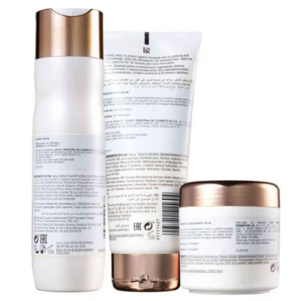 Um shampoo delicado que ajuda a recuperar o cabelo danificado, deixando os fios limpos e tratados. Com EDDS, lipídeos micromizados e aminoácidos, uma nova dimensão em reconstrução capilar. Este shampoo proporciona até 95% mais resistência a quebra, reconstruindo instantaneamente a fibra capilar prevenindo contra futuros danos. Ele repara a porosidade dos cabelos devolvendo a maciez até para os cabelos mais danificados. O condicionador ajuda a proteger os fios contra quebra durante a escovação e danos mecânicos. Ele reconstrói instantaneamente a fibra capilar e ajuda a prevenir futuros danos. Desembaraça o cabelo, deixando-o macio. Com aminoácidos. A Máscara cremosa de tratatamento intensivo ajuda a recuperar os fios e proteger contra a quebra. Com ingredientes intensamente condicionantes e aminoácidos os cabelos ganham força e maciez.
