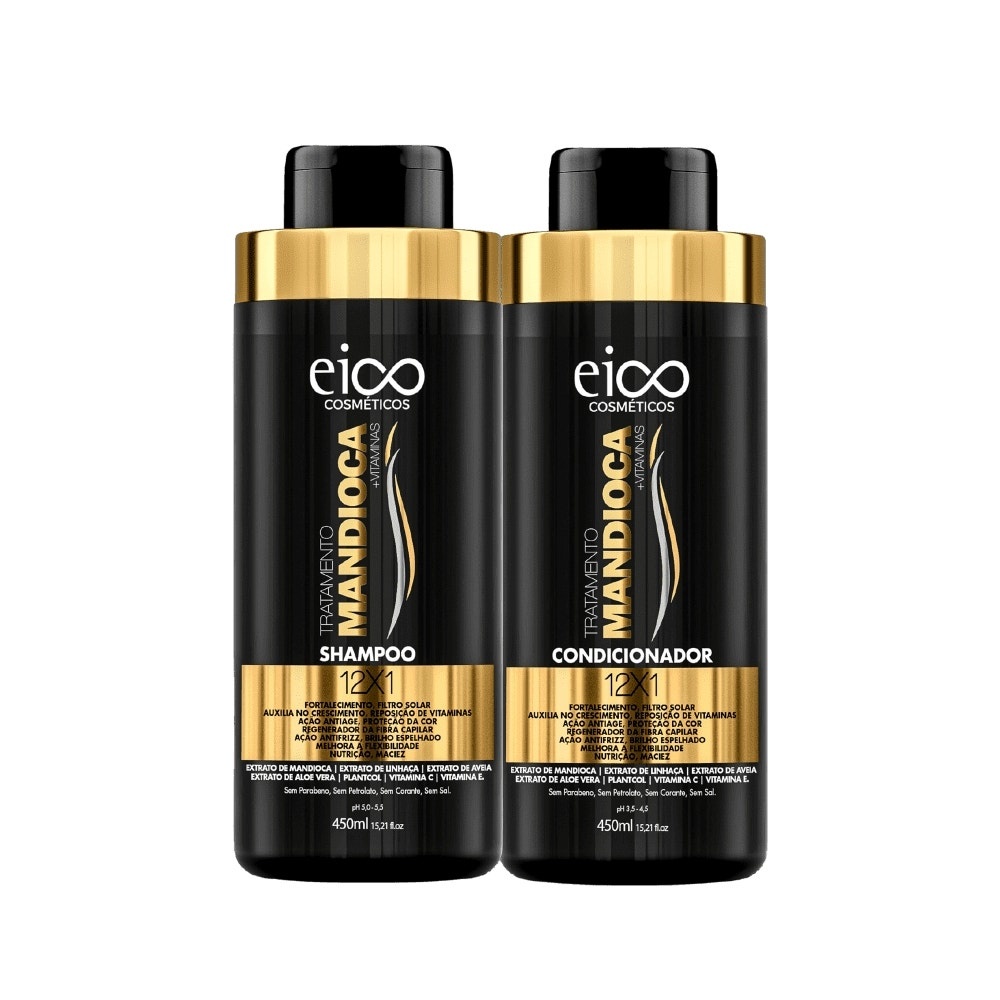 Kit para cabelos danificados. Kit Eico Tratamento Mandioca Duo traz produtos que proporcionam mais de 10 benefícios aos fios. Kit Eico Tratamento Mandioca Duo repõe as vitaminas, auxilia no crescimento saudável, protege, fortalece, regenera a fibra capilar, melhora a flexibilidade, garante brilho e maciez. Além disso, o kit também é ideal para quem deseja reduzir o volume e o frizz do cabelo. Modo de uso: Aplique o shampoo no cabelo molhado e massageie. Em seguida, enxágue e repita a operação. Depois, com o cabelo úmido, espalhe o condicionador do comprimento às pontas dos fios. Deixe agir de 1 a 2 minutos e enxágue bem.