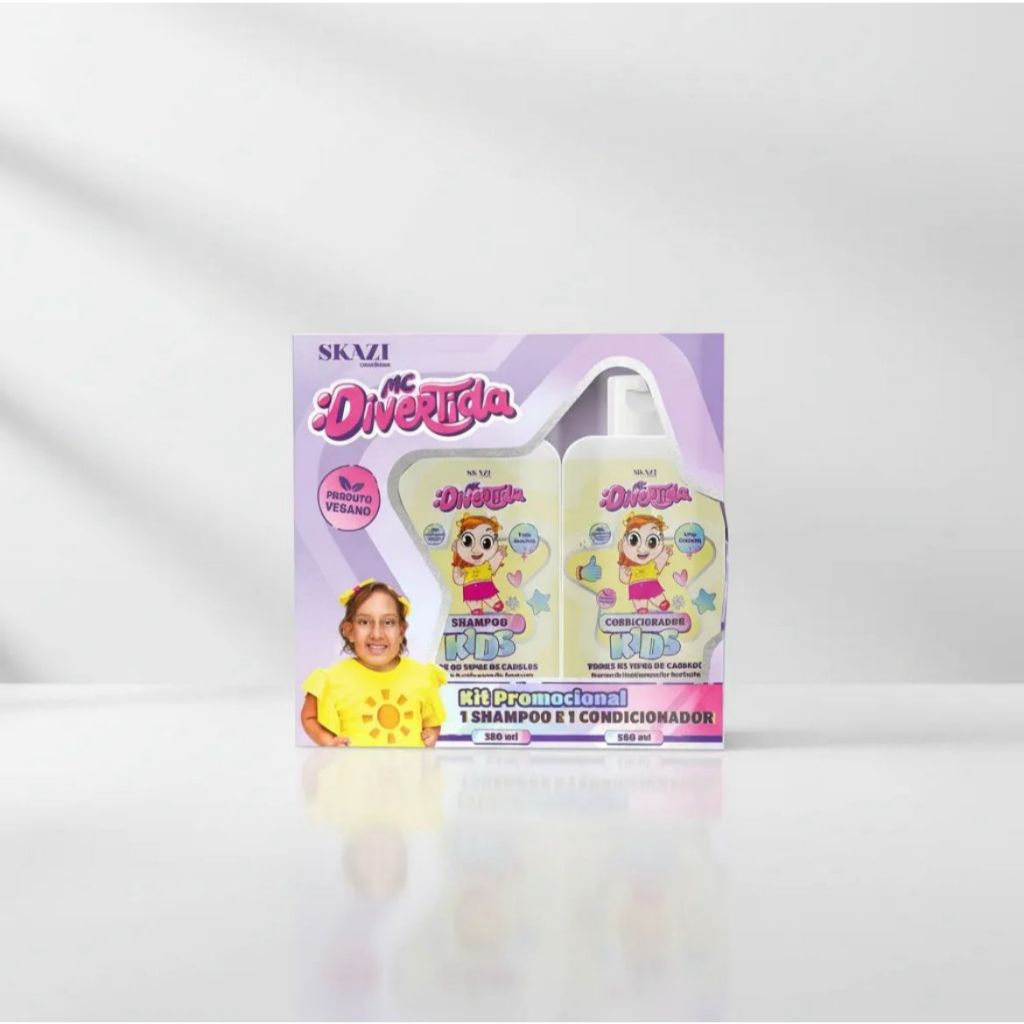 O Kit Promocional Infantil SKAZI Kids MC Divertida – Todos os Tipos de Cabelo foi criado para transformar a rotina de cuidados capilares em um momento de cuidado, diversão e criatividade para as crianças. O kit reúne Shampoo e Condicionador infantis, desenvolvidos para todos os tipos de cabelo, e acompanha uma caixa promocional interativa, com elementos pensados para recorte e brincadeira, estimulando a imaginação e prolongando a experiência após o banho. Os produtos possuem fórmula suave, enriquecida com Babosa (Aloe Vera), que auxilia na limpeza delicada, na hidratação equilibrada e na manutenção da maciez dos fios, respeitando a sensibilidade do couro cabeludo infantil. São indicados para uso diário e dermatologicamente testados. A caixa exclusiva torna o kit ideal para presentear, oferecendo não apenas produtos de cuidado capilar, mas também um momento lúdico que integra higiene e diversão. O kit contém: 1 Shampoo Infantil SKAZI Kids MC Divertida – 250 ml 1 Condicionador Infantil SKAZI Kids MC Divertida – 250 ml 1 Caixa promocional interativa com elementos para recorte e brincadeira Principais benefícios: Indicado para todos os tipos de cabelo Com Babosa (Aloe Vera) Limpeza suave e hidratação equilibrada Facilita o desembaraço Fórmula adequada para uso infantil Dermatologicamente testado Produto vegano Caixa interativa que estimula a criatividade Modo de uso: Aplique o shampoo nos cabelos molhados, massageando suavemente até formar espuma e enxágue bem. Em seguida, aplique o condicionador no comprimento e pontas, massageie delicadamente e enxágue. Após o uso dos produtos, a caixa pode ser utilizada para recorte e brincadeiras, conforme indicado. Informações do produto: Linha: SKAZI Kids – collab MC Divertida Indicação: Uso infantil Tipo de cabelo: Todos os tipos de cabelo Conteúdo do kit: Shampoo 250 ml + Condicionador 250 ml