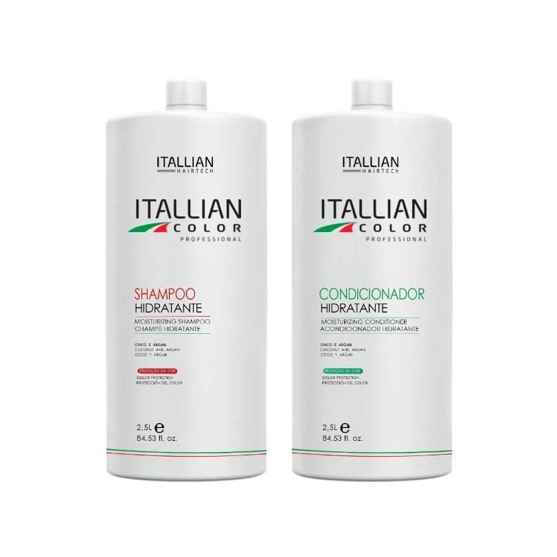 KIT SHAMPOO + CONDICIONADOR LAVATORIO 2,5L | ITALLIAN COLOR Shampoo Hidratante Itallian Color de 2.5 litros para lavatórios, rende mais de 180 aplicações. Proteção contra ressecamento, nutrição profunda da fibra capilar, controle de frizz, hidratação, brilho, maciez, umectação e emoliência aos fios. Condicionador Hidratante Itallian Color de 2.5 litros para lavatórios, rende mais de 180 aplicações. Contra ressecamento, evita pontas duplas, nutri profundamente a fibra capilar, controla frizz, hidrata, dá brilho, maciez, umectação e emoliência. Possui efeito de toque sedoso. Ativos: -Blend de Óleos: Mix de 12 óleos preciosos obtidos a partir de nozes, sementes, ervas e frutos (Coco, Argan, Noz de Karité, Semente de Algodão, Macadâmia, Chá Verde, Camomila, Aloe Vera, Cálamo, Mirra, Oliva e Canela). Protege os fios contra o ressecamento Proporciona nutrição avançada das camadas mais profundas da fibra capilar Disciplina e controla o frizz -Proteína da Seda: É extraída das fibras puras da seda sob condições extremamente controladas. Estas fibras naturais são constituídas por estruturas denominadas fibroínas, que são revestidas de sericina. As fibroínas são ricas em aminoácidos (glicina, alanina, tirosina e serina), que fazem parte da composição da fibra capilar. Brilho acentuado Umectação e emoliência aos fios -Pantenol: Agente condicionante também conhecido como Pró-Vitamina B5. Auxilia na retenção de umidade dos fios Evita a formação de pontas duplas Confere brilho e maciez -Silicones: Combinação de silicones multifuncionais e com grande afinidade pela fibra capilar. Espalha-se facilmente sobre os fios Possui toque sedoso, não oleoso e não pegajoso COMO USAR: Após lavar os cabelos com o Shampoo Hidratante Itallian Color, aplique o Condicionador Hidratante Itallian Color do comprimento às pontas. Deixe agir por alguns minutos e enxágue. CONTÉM 01 Shampoo 2,5L Hidratante Lavatório Itallian Color Professional 01 Condicionador 2,5L Hidratante Lavatório Itallian Color Professional