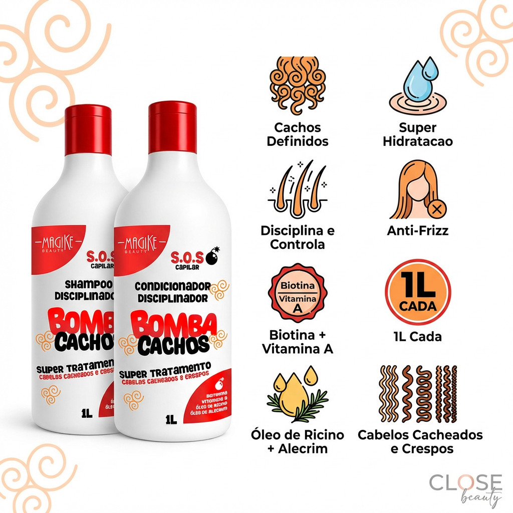 Kit Shampoo Condicionador Magike Beauty Bomba Cachos 1L+1L Cachos Definidos Cacheados Crespos