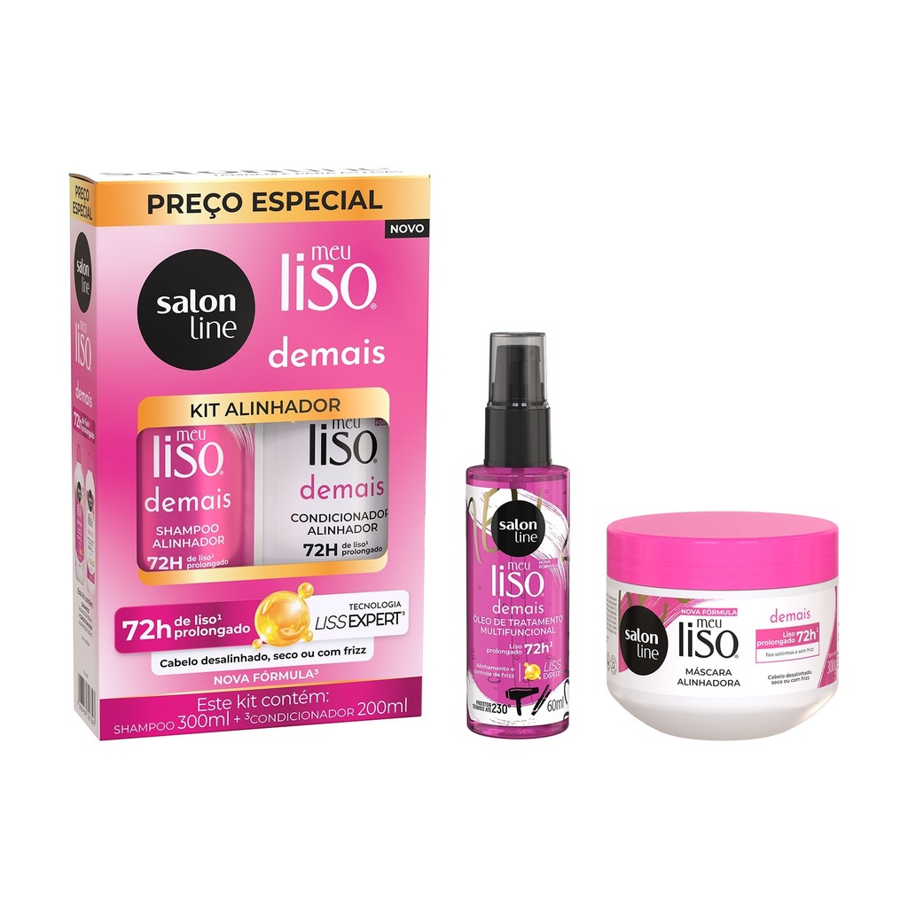 O kit reúne o Shampoo 300ml, o Condicionador 200ml, a Máscara Hidratante 300g e o Óleo de Tratamento Multifuncional 60ml da linha Meu Liso Demais da Salon Line, oferecendo uma rotina completa para cabelos lisos naturais, alisados ou relaxados. Proporcionando limpeza, hidratação e controle do frizz. <>INDICAÇÕES$& Para quais tipos de cabelo? Liso. Qual a indicação? desalinhado, ressecado, com frizz. Pode usar a partir de quantos anos? A partir de 12 anos. <>ATIVOS$& Quais os principais ativos? Kit Shampoo 300ml + Condicionador 200ml, Óleo Multifuncional e Máscara Hidratante Meu Liso Demais Contém D-pantenol, creatina e colágeno vegetal que, juntos, garantem hidratação profunda, zero frizz e movimento natural, sem pesar nos fios. <>MODO DE USO$& Qual a melhor forma de usar? Kit Shampoo e Condicionador Meu Liso Demais Shampoo Alinhador Meu Liso Demais: Aplique o shampoo no cabelo úmido, massageie e enxágue. Se necessário, repita a aplicação. Condicionador Alinhador Meu Liso Demais: Aplique o produto no cabelo úmido e espalhe uniformemente. Deixe agir entre 1 e 3 minutos. Enxágue bem por toda a extensão dos fios. Máscara Hidratante Meu Liso Demais Com o cabelo limpo e úmido, aplique a Máscara Hidratante Demais mecha por mecha, massageando no sentido da raiz para as pontas. Deixe agir entre 5 e 10 minutos. Enxágue bem. Pode ser usada diariamente. Óleo Multifuncional Meu Liso Demais Finalizador: aplique algumas gotas na palma da mão e espalhe bem no cabelo seco ou úmido, do comprimento às pontas. Protetor térmico: aplique conforme orientações acima e siga com o uso da ferramenta de calor desejada. Misturinha: após lavar o shampoo, misture algumas gotas do óleo na máscara, aplique o comprimento às pontas, aguarde 3 minutos e enxágue. Umectação: aplique o produto no cabelo mecha a mecha e deixe agir por, no mínimo, 30 minutos. <>CARACTERÍSTICAS$& É produto vegano? Todos os produtos são veganos. É liberado? Nenhum dos produtos são liberados.