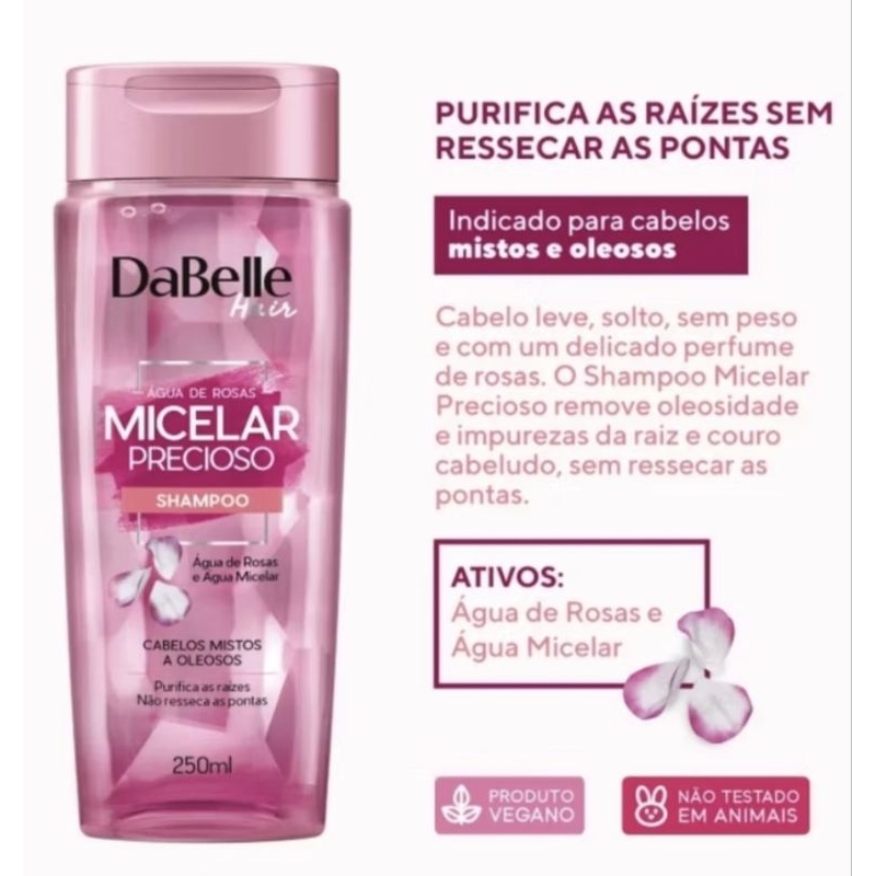 Descrição Kit DaBelle Micelar Precioso Trio Kit de cuidados para cabelos oleosos e mistos. Kit DaBelle Micelar Precioso Trio garante um cabelo leve, solto, sem peso e com um delicado perfume de rosas. DaBelle Hair Micelar Precioso - Shampoo 250ml: remove oleosidade e impurezas da raiz e couro cabeludo, sem ressecar as pontas. DaBelle Hair Micelar Precioso - Condicionador 175ml: alinha as cutículas pra suavizar as pontas e facilitar o desembaraço sem pesar nos fios. Ação ÁGUA DE ROSAS: Tem poder hidratante e antioxidante, cuida das áreas mais sensíveis dos fios oleosos a mistos, as pontas. ÁGUA MICELAR: Purifica os fios sem agredir ou ressecar os cabelos. Como Usar Kit DaBelle Micelar Precioso Conselho de Aplicação SHAMPOO: Aplique no cabelo a quantidade certa pra você, massageie até fazer uma espuma cremosa e enxágue bem. Você pode repetir a aplicação se precisar. CONDICIONADOR: Aplique a quantidade certa pra você no comprimento, evitando a área da raiz e concentre mais nas pontas. Massageie delicadamente no sentido do crescimento dos cabelos até enluvar os fios e depois enxágue bem. Resultado Seu cabelo leve, hidratado e sem peso! E ainda com delicado perfume de rosas.